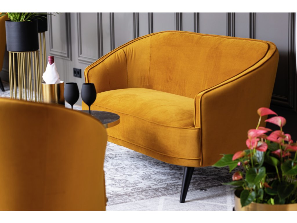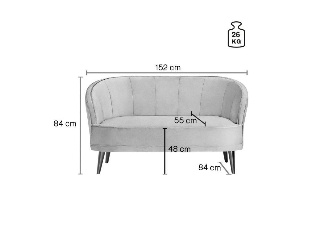 Elegantná 2-miestna pohovka so zamatovým poťahom (100 % polyester) a čiernymi lakovanými bukovými nohami. Elegantné prešívanie na vnútornej strane zvýrazňuje pohovku. Vzdialenosť od podlahy je 20 cm. Vhodná len na použitie v interiéri. Dodávka je v demonte, nohy pripevnite pomocou dodaného montážneho materiálu.Dodatočné parametre