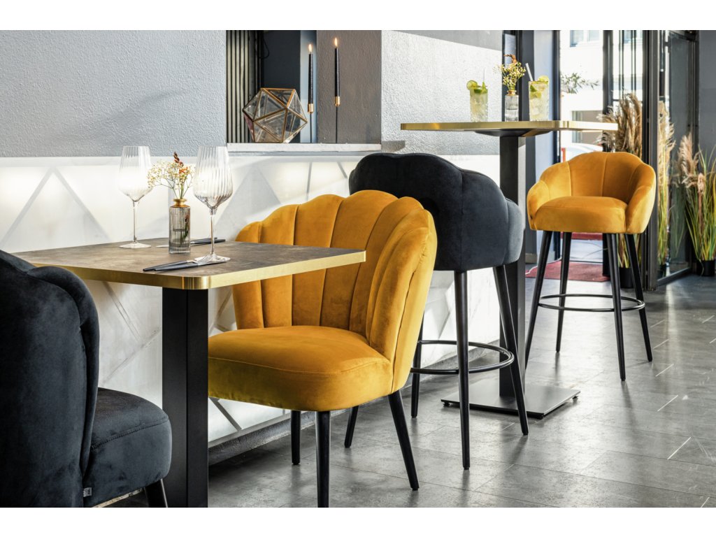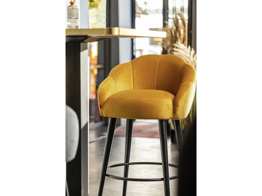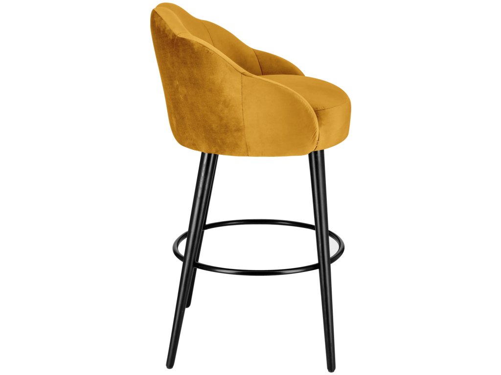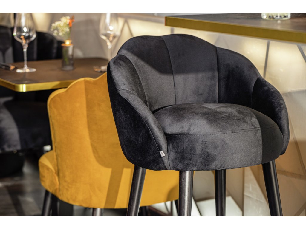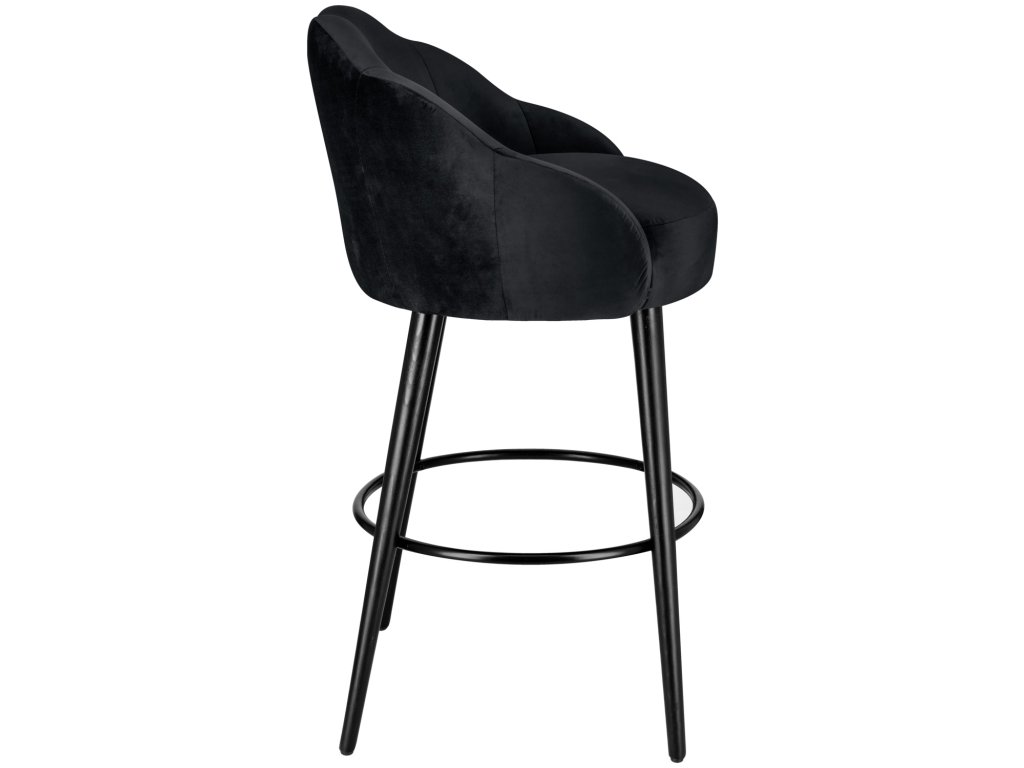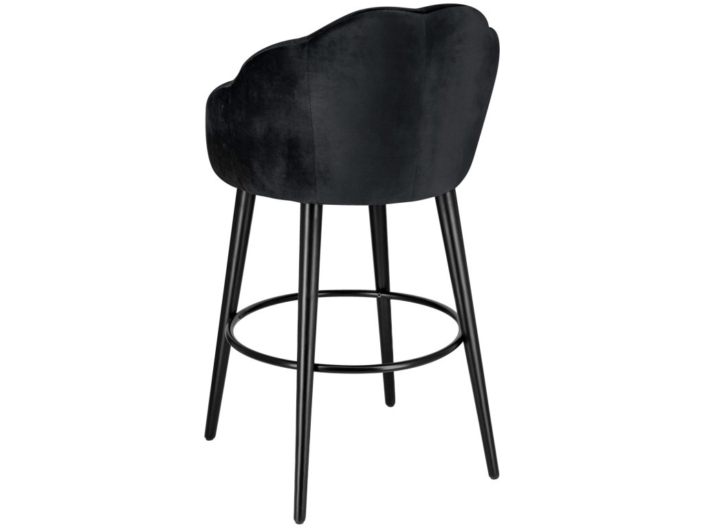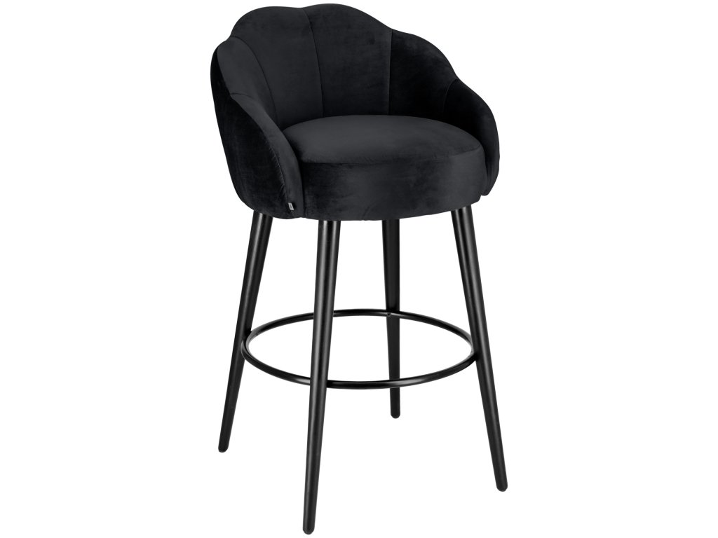 Vysokokvalitná barová stolička, poťah zo zamatovej tkaniny (100 % polyester), čierne lakované bukové nohy. Prešívanie na vnútornej strane zvýrazňuje stoličku. Nehorľavý poťah. Oceľová opierka na nohy. Vhodná len na použitie v interiéri. Dodáva sa zmontovaná.Dodatočné parametre
