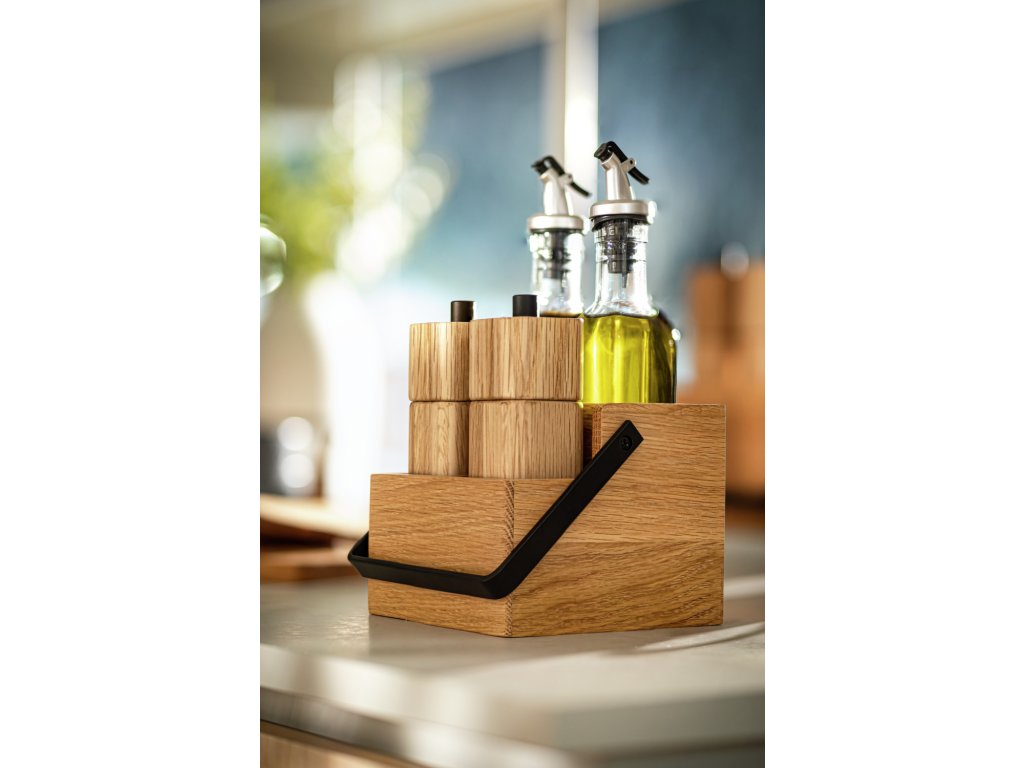 Besteckbehälter aus Eichenholz mit klappbarem pulverbeschichtetem Stahlgriff. Die Kunststoffmatte am Boden verhindert die Verschmutzung des Holzes und lässt sich zum reinigen herausnehmen. Zwei kleine Staufächer (6x6 cm) und ein großes Staufach (12,8x6 cm). Nicht spülmaschinengeeignet.Dodatočné parametre