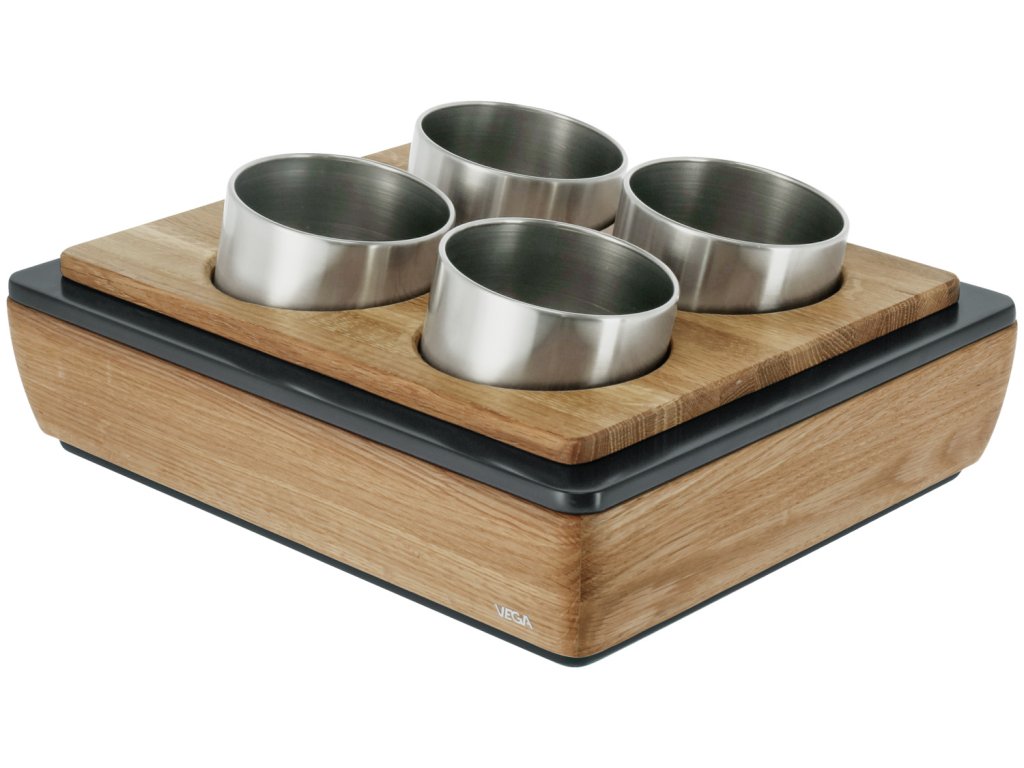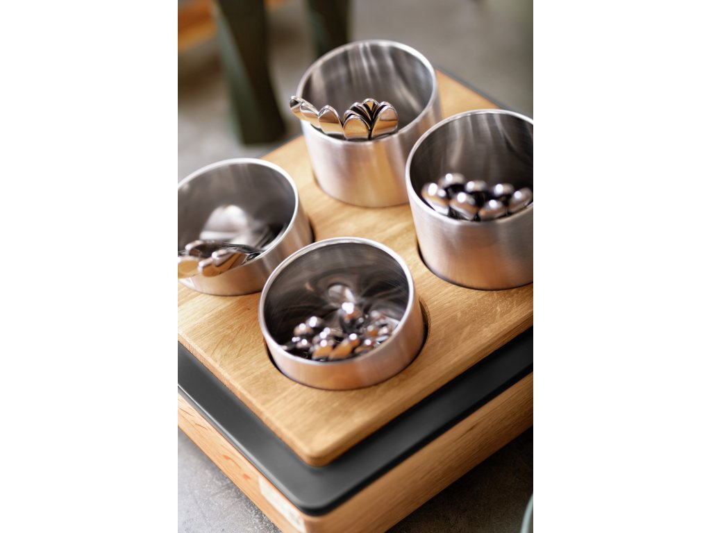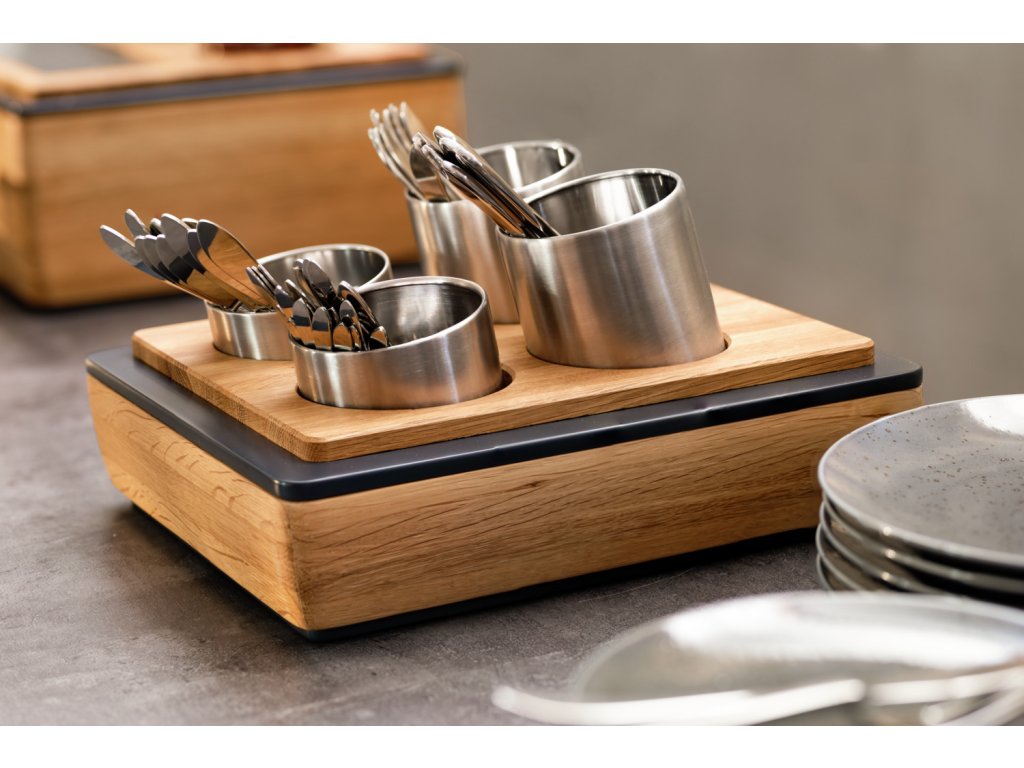 Držiak na príbory pozostáva zo základnej skrinky plochej 1/2 z dubového masívu s MDF krytom, základnej tácky z vysokokvalitného plastu s tepelnou odolnosťou do 70 °C, zodpovedajúceho nástavca na držiaky príborov z dubového masívu a držiakov na príbory z nehrdzavejúcej ocele 18/10 vo veľkostiach: 2x 10x8,5 cm (ØxV) a 2x 10x13 cm. Tie sú ideálne aj na obrúsky alebo tyčinky na cukor. Drevené časti sa dajú utierať vlhkou handričkou, držiaky na príbory sa dajú umývať v umývačke riadu.Dodatočné parametre