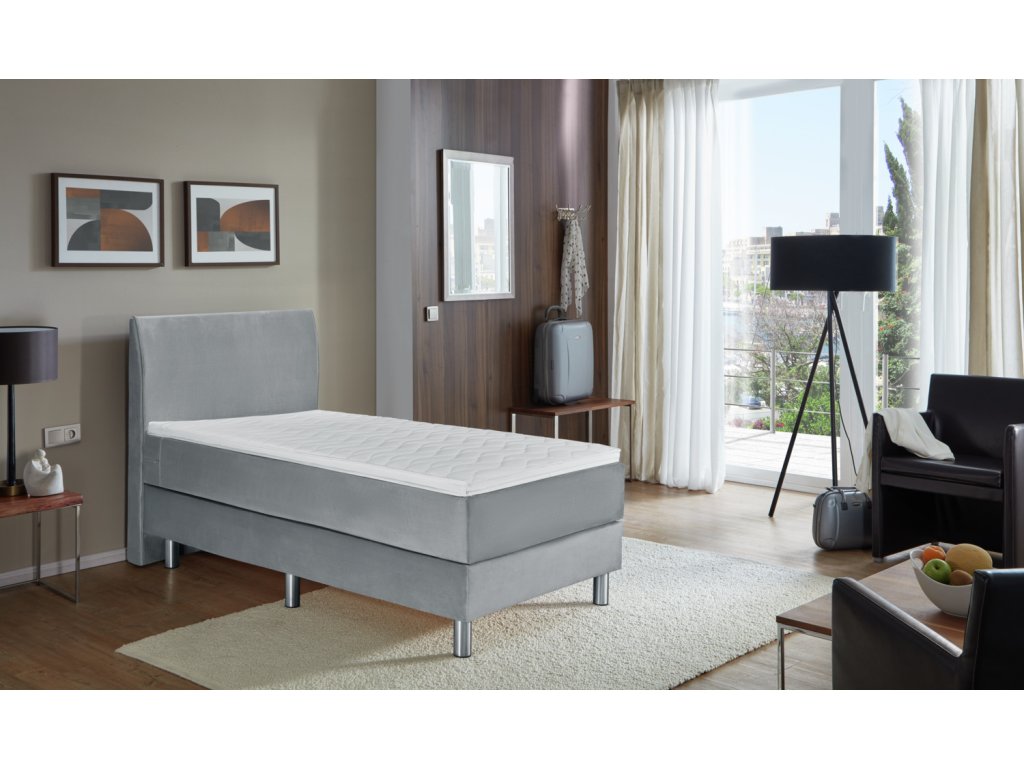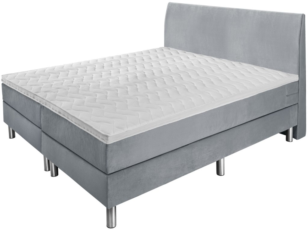 Box spring posteľ v praktickej kompletnej súprave. Box s pružinovým jadrom Bonell. Pružiny Bonell s hrúbkou 2,2 mm. Čalúnený rám. Vrchná časť zo studenej peny pre dobrý komfort spánku. Klasické, rovne lemované čelo postele - výška 110 cm. Nehrdzavejúce kovové nožičky v striebornej farbe. Vstupná výška: 63 cm. Výška nožičiek 16 cm + box 20 cm + matrac 21 cm + topper 6 cm spolu: 63 cm. S velúrovým poťahom. K dispozícii ako jednolôžko alebo manželská posteľ. Dodávka vrátane spojovacích prvkov. Nožičky postele sa pri dodaní nachádzajú v krabici.Dodatočné parametre