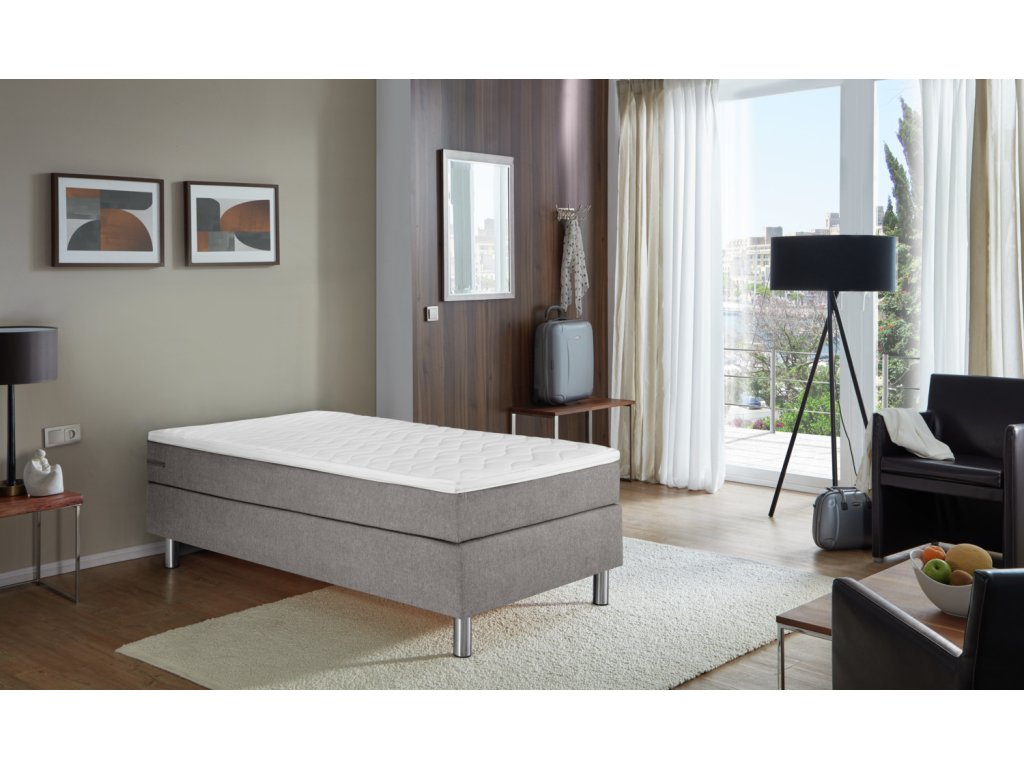 Box spring posteľ v praktickej kompletnej súprave. Box s päťzónovým taštičkovým pružinovým jadrom, matrac s 540 pružinami na 2 m². Čalúnený rám z masívneho dreva. 7-zónový taštičkový pružinový matrac s 920 pružinami na 2 m². Vrchná vrstva z gélovej peny pre dobrý komfort spánku. Bez chrbtovej časti. Nehrdzavejúce kovové nožičky v striebornej farbe. Vstupná výška: 69 cm. Výška nožičiek 16 cm + box 27 cm + matrac 21 cm + topper 5 cm spolu: 69 cm. S poťahom z čalúnnickej látky. K dispozícii ako jednolôžko alebo manželská posteľ. Dodávka vrátane spojovacích prvkov. Nožičky postele sa pri dodaní nachádzajú v krabici.Dodatočné parametre