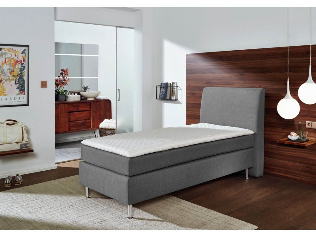 Box spring posteľ v praktickej kompletnej súprave. Box s päťzónovým taštičkovým pružinovým jadrom, matrac s 540 pružinami na 2 m². Čalúnený rám z masívneho dreva. 7-zónový taštičkový pružinový matrac s 920 pružinami na 2 m². Vrchná vrstva z gélovej peny pre dobrý komfort spánku. Klasické, rovno lemované čelo postele - výška 110 cm. Nehrdzavejúce kovové nožičky v striebornej farbe. Vstupná výška: 69 cm. Výška nožičiek 16 cm + skrinka 27 cm + matrac 21 cm + topper 5 cm spolu: 69 cm. S poťahom z čalúnnickej látky. K dispozícii ako jednolôžko alebo manželská posteľ. Dodávka vrátane spojovacích prvkov. Nožičky postele sa pri dodaní nachádzajú v krabici.Dodatočné parametre