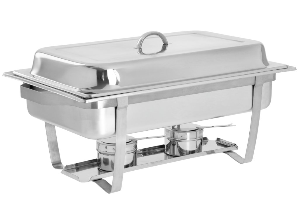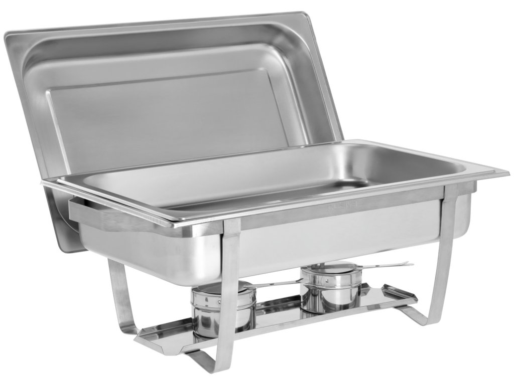 Chafing dish z nehrdzavejúcej ocele. Nerezová oceľ. S vysoko lešteným vekom, GN nádoba na potraviny. Rám s úchytkami a držiakom vrchnáku. GN nádoba na potraviny vhodná do umývačky riadu. Dodáva sa s dvoma nádobami na fritovaciu pastu. Dodávaná nádoba na potraviny má hĺbku 6,5 cm.Dodatočné parametre