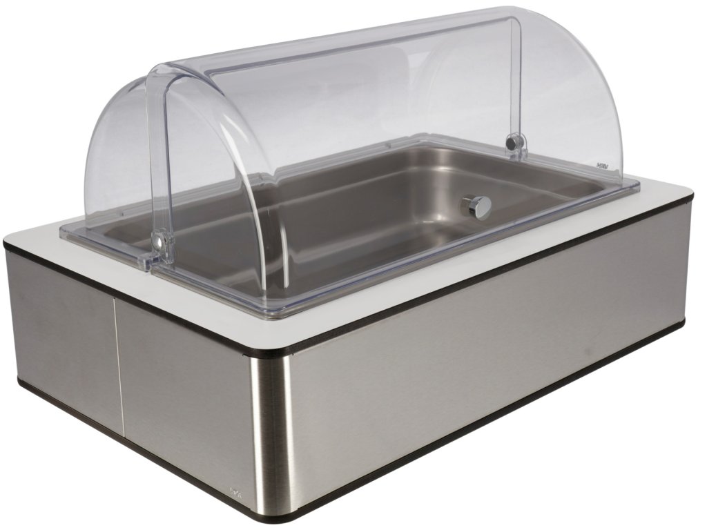 Chladiaca vitrína sa skladá zo základného vysokého boxu z vysokokvalitnej brúsenej nehrdzavejúcej ocele 18/10 s bielym laminátovým obložením, základnej vaničky z vysokokvalitného plastu s tepelnou odolnosťou do 70 °C, zodpovedajúceho polyetylénového chladiaceho obalu, 10 cm hlbokej GN nádoby z chrómniklovej nehrdzavejúcej ocele 18/10, nerezovej ocele s praktickým stohovacím vačkom, zosilnenými rohmi a hranami a litrovou stupnicou a nerozbitné rolovacie veko Sturgis z vysokokvalitného Tritanu (bez bisfenolu A) s protišmykovou pogumovanou zarážkou na tiché otváranie a zatváranie. Nádoba GN je vhodná do umývačky riadu, všetky ostatné časti nie.Dodatočné parametre
