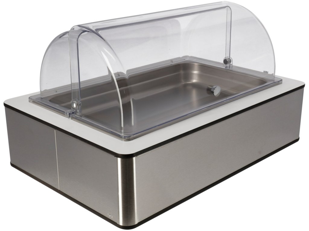 Chladiaca vitrína pozostáva z vysokokvalitnej brúsenej nehrdzavejúcej ocele 18/10 s bielym laminátovým panelom, základnej vaničky z vysokokvalitného plastu s tepelnou odolnosťou do 70 °C, zodpovedajúceho polyetylénového obalu na ľad, 6,5 cm hlbokej GN nádoby z chrómniklovej nehrdzavejúcej ocele 18/10, nerezovej ocele s praktickým stohovacím vačkom, zosilnenými rohmi a hranami a litrovou stupnicou a nerozbitné rolovacie veko Sturgis z vysokokvalitného Tritanu (bez obsahu bisfenolu A) s protišmykovou pogumovanou zarážkou na tiché otváranie a zatváranie. Nádoba GN je vhodná do umývačky riadu, všetky ostatné časti nie.Dodatočné parametre