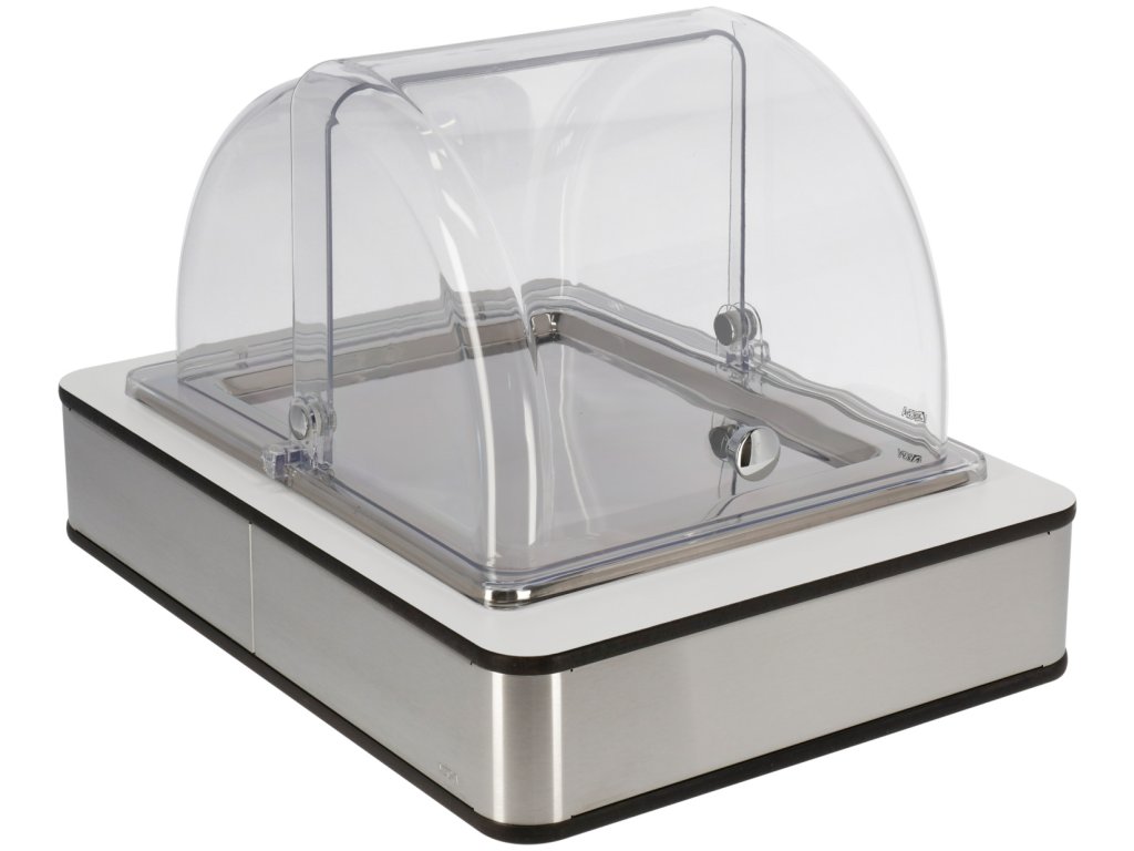 Chladiaca vitrína pozostáva z vysokokvalitnej brúsenej nehrdzavejúcej ocele 18/10 s bielym laminátovým panelom, základnej vaničky z vysokokvalitného plastu s tepelnou odolnosťou do 70 °C, zodpovedajúceho polyetylénového obalu na ľad, stohovateľnej prezentačnej dosky z chrómniklovej nehrdzavejúcej ocele 18/8 vo veľkosti 1/2 GN s protišmykovými nožičkami a nerozbitného rolovacieho krytu Sturgis z vysokokvalitného Tritanu (bez bisfenolu A) s protišmykovou pogumovanou zarážkou na tiché otváranie a zatváranie. Prezentačná doska je vhodná na umývanie v umývačke riadu, všetky ostatné časti nie.Dodatočné parametre