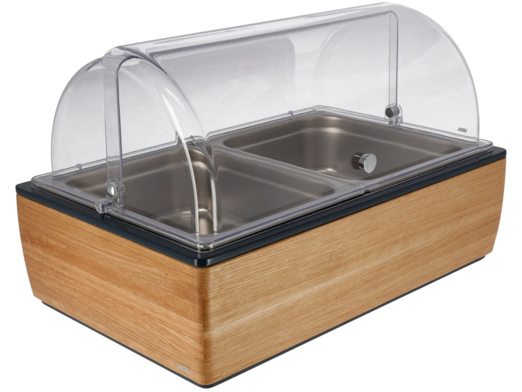 Chladiaca vitrína sa skladá z vysokej základnej skrinky z masívneho dubového dreva s MDF panelom, základnej vaničky z vysokokvalitného plastu s tepelnou odolnosťou do 70 °C, zodpovedajúceho polyetylénového obalu na ľad, 2x 10 cm hlbokej GN nádoby 1/2 z chrómniklovej nehrdzavejúcej ocele 18/10, stohovateľná, zosilnenými rohmi a hranami a litrovou stupnicou a nerozbitné rolovacie veko Sturgis z vysokokvalitného Tritanu (bez bisfenolu A) s protišmykovou pogumovanou zarážkou na tiché otváranie a zatváranie. Nádoba GN je vhodná do umývačky riadu, všetky ostatné časti nie.Dodatočné parametre