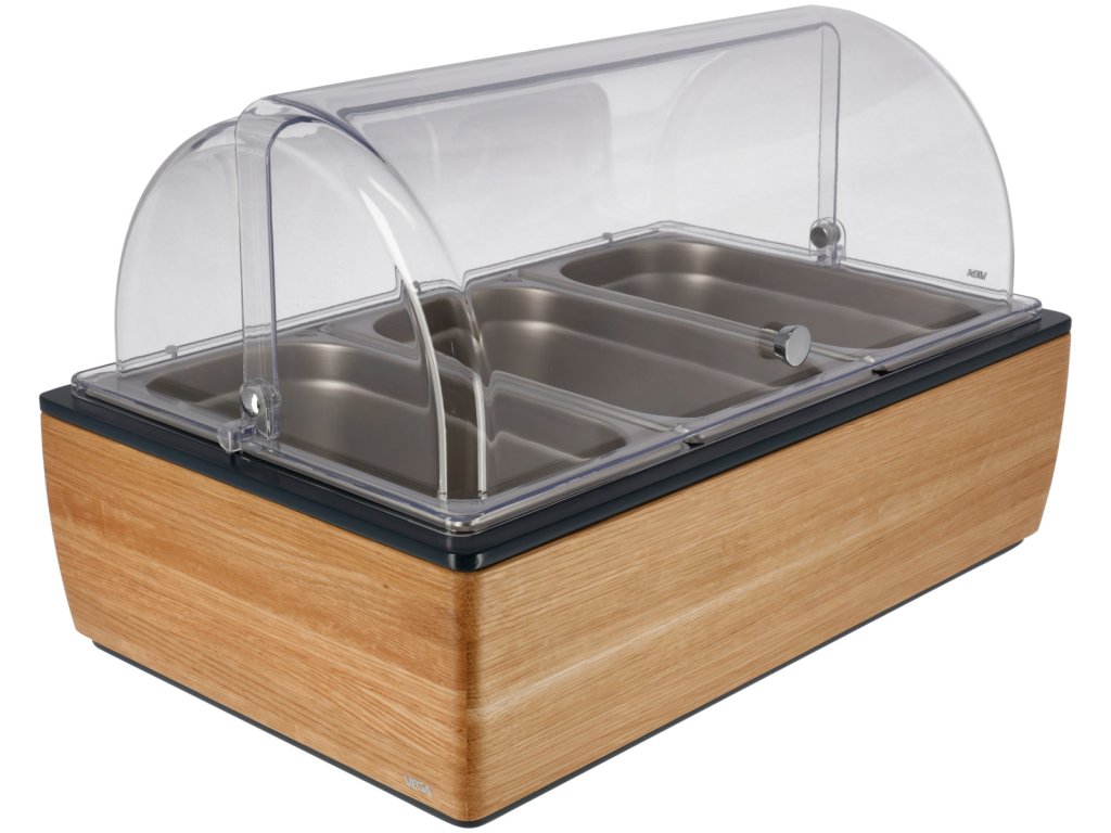 Chladiaca vitrína sa skladá z vysokej základnej skrinky z masívneho dubového dreva s MDF panelom, základnej tácky z vysokokvalitného plastu s tepelnou odolnosťou do 70 °C, zodpovedajúceho polyetylénového obalu na ľad, 3x 10 cm hlbokej GN nádoby 1/3 z chrómniklovej nehrdzavejúcej ocele 18/10, nerez, s praktickým stohovacím vačkom, zosilnenými rohmi a hranami a litrovou stupnicou a nerozbitné rolovacie veko Sturgis z vysokokvalitného Tritanu (bez bisfenolu A) s protišmykovou pogumovanou zarážkou na tiché otváranie a zatváranie. Nádoba GN je vhodná do umývačky riadu, všetky ostatné časti nie.Dodatočné parametre
