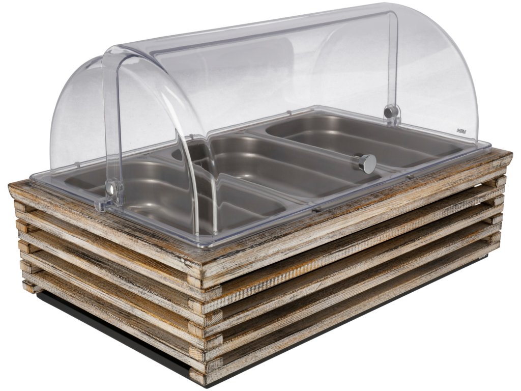 Chladiaca vitrína pozostávajúca zo základnej skrinky vysokej z masívneho dreva, základnej tácky z vysokokvalitného plastu s tepelnou odolnosťou do 70 °C, zodpovedajúceho polyetylénového obalu na ľad, 3 x 6,5 cm hlbokej GN nádoby 1/3 z chrómniklovej nehrdzavejúcej ocele 18/10, nerez, s praktickým stohovacím vačkom, zosilnenými rohmi a hranami a litrovou stupnicou a nerozbitné rolovacie veko Sturgis z vysokokvalitného Tritanu (neobsahuje bisfenol A) s protišmykovým pogumovaným dorazom na tiché otváranie a zatváranie. Nádoba GN je vhodná do umývačky riadu, všetky ostatné časti nie.Dodatočné parametre