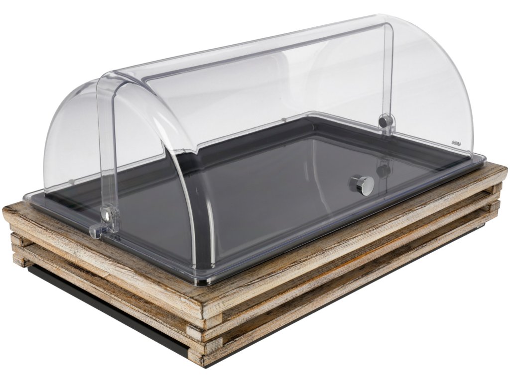 Chladiaca vitrína pozostávajúca z plochej základnej skrinky z masívneho dreva, základnej tácky z vysokokvalitného plastu s tepelnou odolnosťou do 70 °C, zodpovedajúceho polyetylénového obalu na ľad, čiernej, stohovateľnej, nárazuvzdornej a nerozbitnej prezentačnej dosky z melamínu v rozmeroch GN (rozsah použitia: -30 °C až +70 °C) a nerozbitného rolovacieho krytu Sturgis z vysokokvalitného Tritanu (bez bisfenolu A) s protišmykovou pogumovanou zarážkou na tiché otváranie a zatváranie. Prezentačná doska je vhodná na umývanie v umývačke riadu, všetky ostatné časti nie.Dodatočné parametre