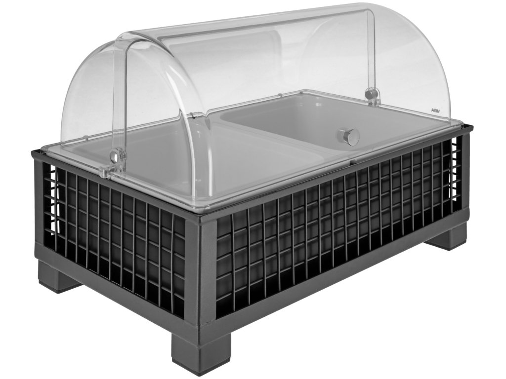 Chladiaca vitrína sa skladá zo stohovateľného vysokého základného boxu z ocele s práškovou povrchovou úpravou, základného podnosu z vysokokvalitného plastu s tepelnou odolnosťou do 70 °C, zodpovedajúceho polyetylénového obalu na ľad, 2x bielej, 10 cm hlbokej, stohovateľnej, nárazuvzdornej a nerozbitnej GN nádoby 1/2 z melamínu (rozsah použitia: -(-30 °C až +70 °C) a nerozbitné rolovacie veko Sturgis z vysokokvalitného Tritanu (bez bisfenolu A) s protišmykovou pogumovanou zarážkou na tiché otváranie a zatváranie. Nádoba GN je vhodná na umývanie v umývačke riadu, všetky ostatné časti nie.Dodatočné parametre