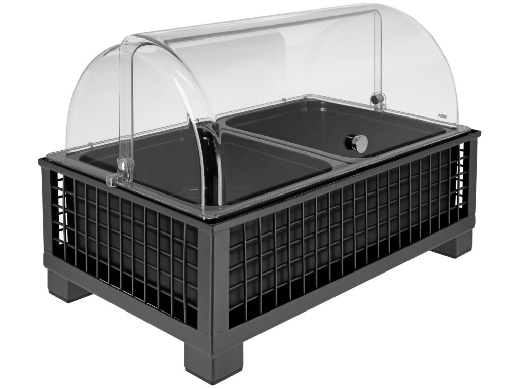 Chladiaca vitrína sa skladá zo stohovateľného vysokého základného boxu z ocele s práškovou povrchovou úpravou, základného podnosu z vysokokvalitného plastu s tepelnou odolnosťou do 70 °C, zodpovedajúceho polyetylénového obalu na ľad, 2x čiernej, 10 cm hlbokej, stohovateľnej, nárazuvzdornej a nerozbitnej GN nádoby 1/2 z melamínu (rozsah použitia: -30 °C až +70 °C) a nerozbitné rolovacie veko Sturgis z vysokokvalitného Tritanu (bez bisfenolu A) s protišmykovou pogumovanou zarážkou na tiché otváranie a zatváranie. Nádoba GN je vhodná na umývanie v umývačke riadu, všetky ostatné časti nie.Dodatočné parametre