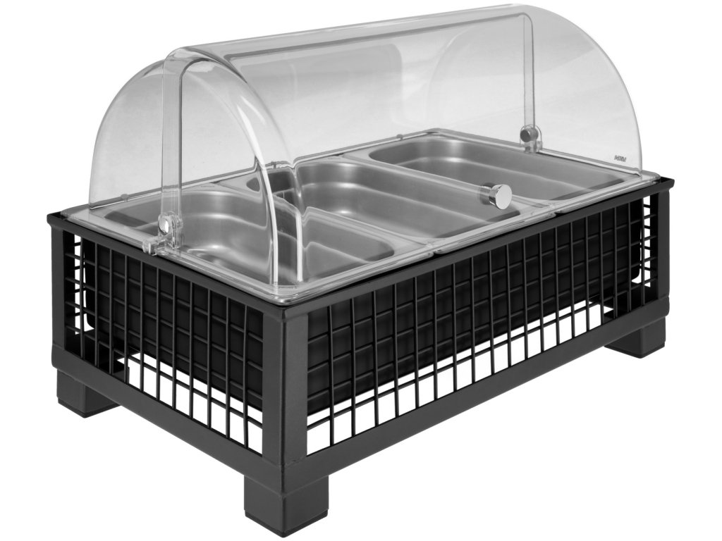 Chladiaca vitrína sa skladá zo stohovateľného vysokého základného boxu z práškovo lakovanej ocele, základného podnosu z vysokokvalitného plastu s tepelnou odolnosťou do 70 °C, zodpovedajúceho polyetylénového obalu na ľad, 3x 6,5 cm hlbokých GN nádob 1/3 z chrómniklovej nehrdzavejúcej ocele 18/10, nerez, s praktickým stohovacím vačkom, zosilnenými rohmi a hranami a litrovou stupnicou a nerozbitné rolovacie veko Sturgis z vysokokvalitného Tritanu (bez bisfenolu A) s protišmykovou pogumovanou zarážkou na tiché otváranie a zatváranie. Nádoba GN je vhodná do umývačky riadu, všetky ostatné časti nie.Dodatočné parametre
