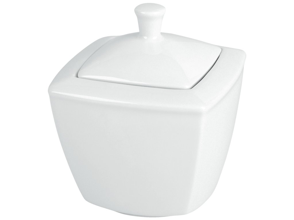 Biela porcelánová cukornička s viečkom. Štvorcový tvar. Jednoduchý dizajn. Vhodná do umývačky riadu a mikrovlnnej rúry.Dodatočné parametre