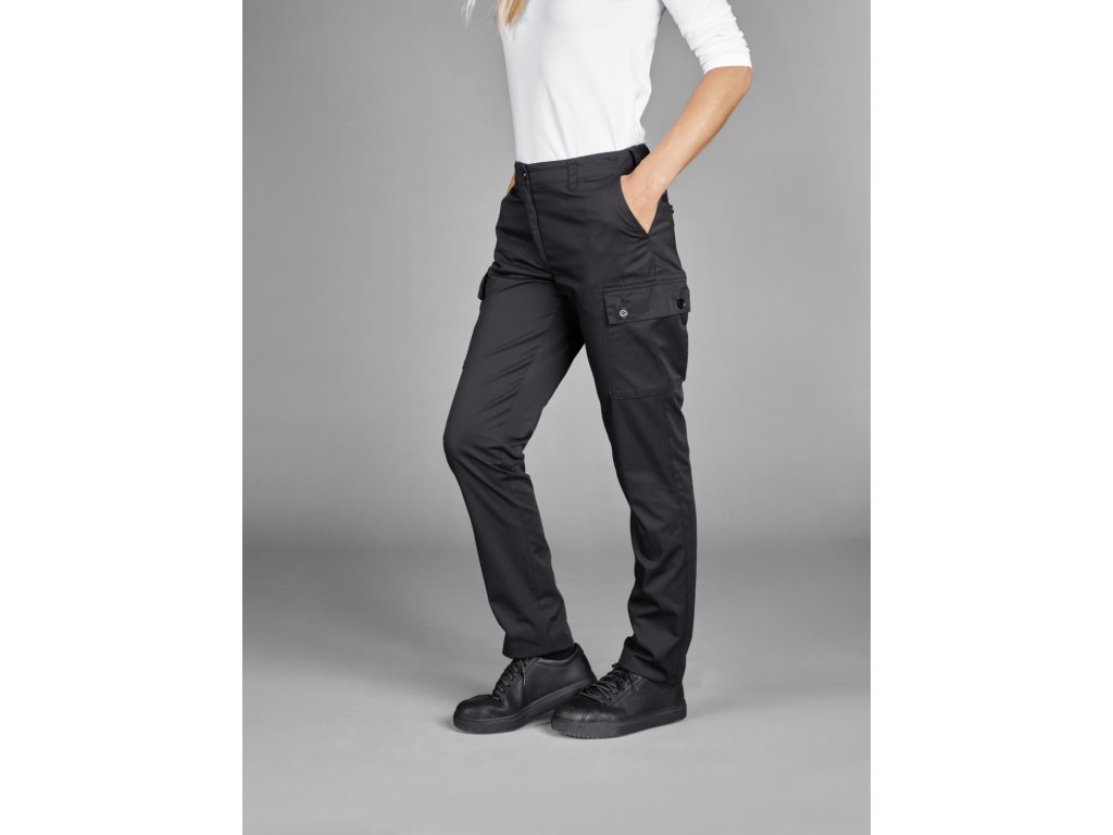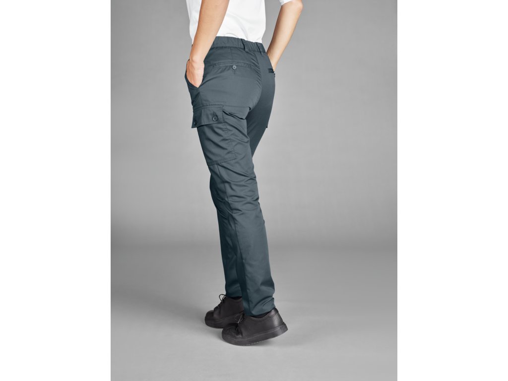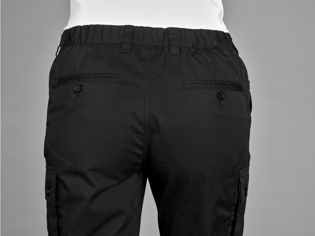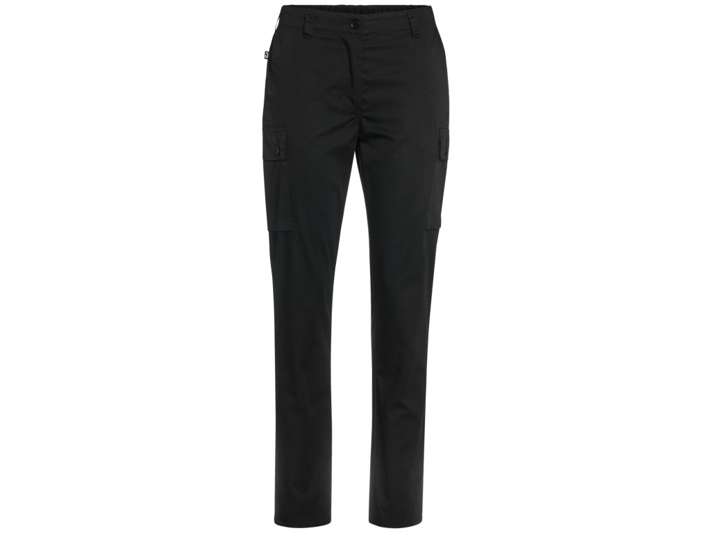 65 % bavlna, 35 % polyester. 150 g/m². Pranie na 60°. Športové dámske kuchárske nohavice z vysokokvalitnej, mimoriadne ľahkej zmesi bavlny a polyesteru. S dvoma veľkými cargo vreckami na nohaviciach a pohodlným elastickým pásom na zadnej strane. Tiež s dvoma zadnými vreckami na gombíky, bočnými rozparkovými vreckami a pútkami na opasok na páse. Pohodlný strih s mierne zúženou nohou. Vnútorná dĺžka nohavíc: 80 cm vo veľkosti 36Dodatočné parametre
