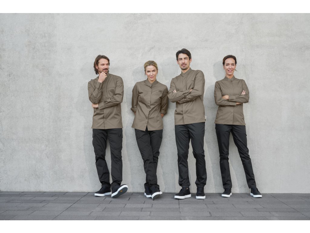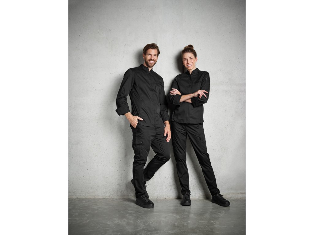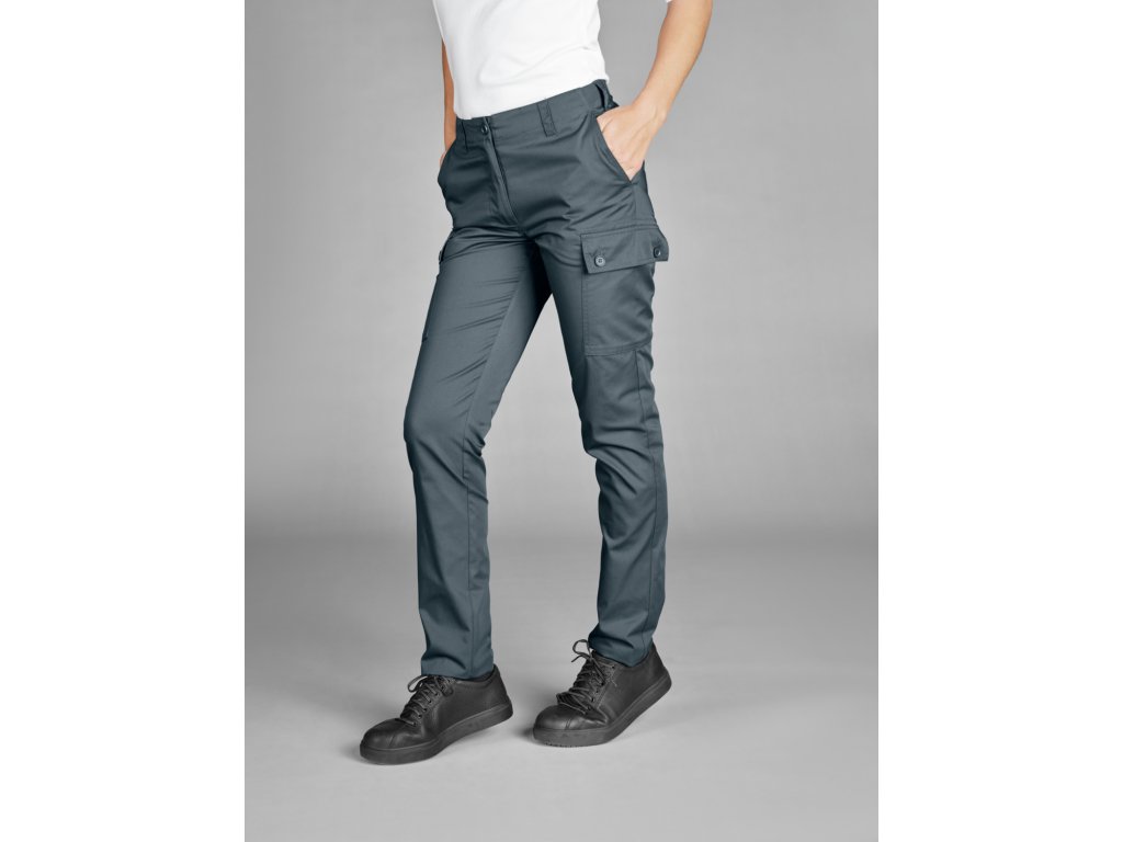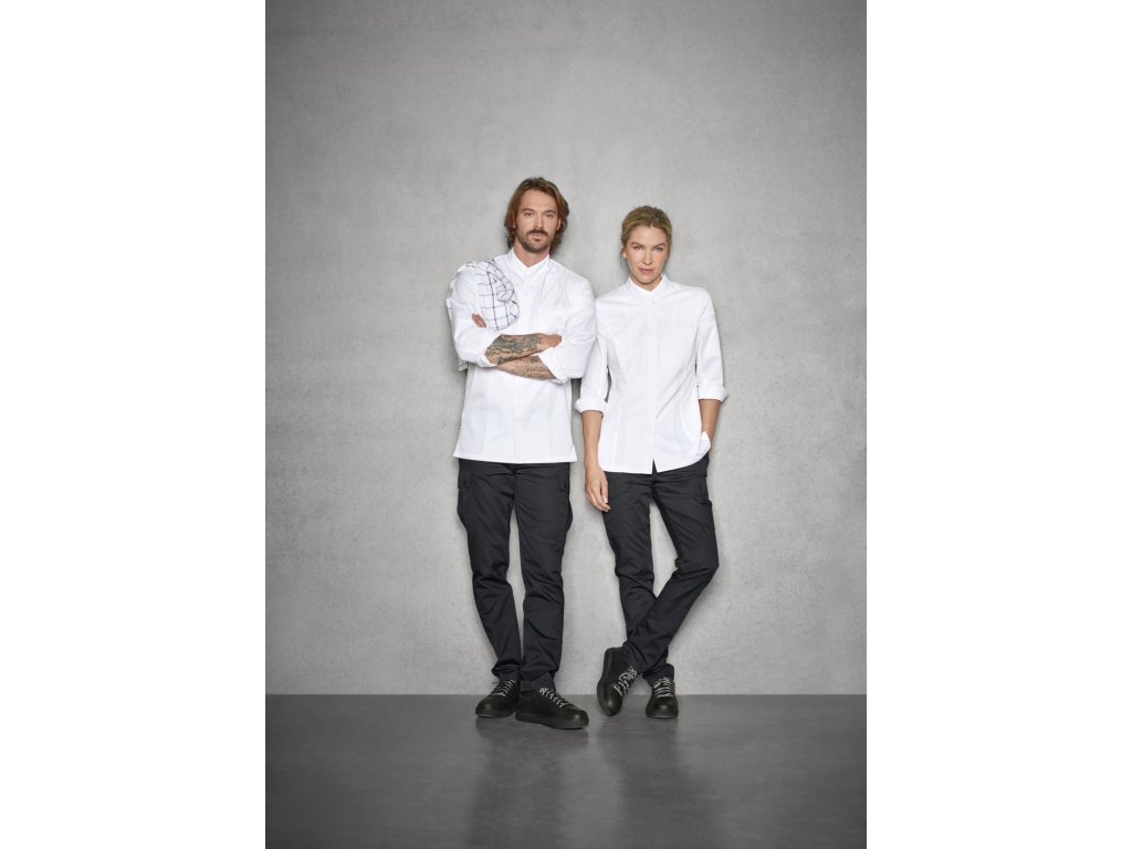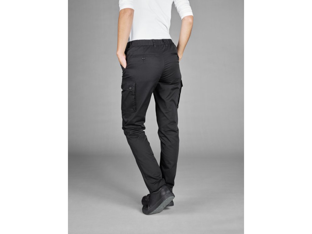 65 % bavlna, 35 % polyester. 150 g/m². Pranie na 60°. Športové dámske kuchárske nohavice z vysokokvalitnej, mimoriadne ľahkej zmesi bavlny a polyesteru. S dvoma veľkými cargo vreckami na nohaviciach a pohodlným elastickým pásom na zadnej strane. Tiež s dvoma zadnými vreckami na gombíky, bočnými rozparkovými vreckami a pútkami na opasok na páse. Pohodlný strih s mierne zúženou nohou. Vnútorná dĺžka nohavíc: 80 cm vo veľkosti 36Dodatočné parametre