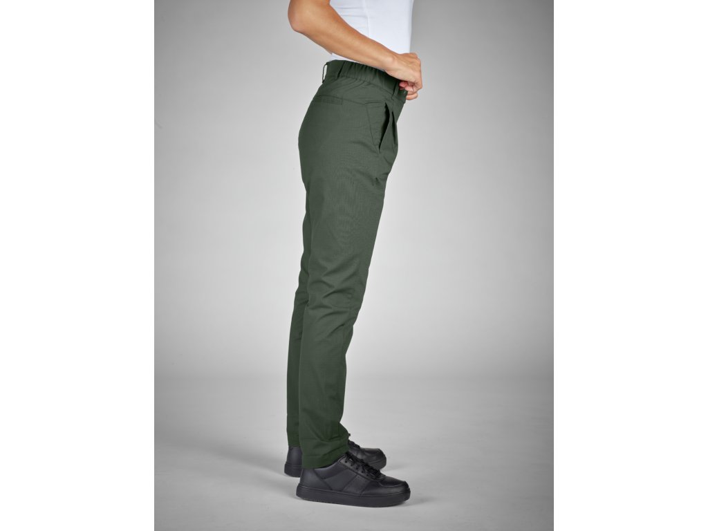 64 % polyester, 34 % bavlna, 2 % elastan. 230 g/m². Pranie na 60°. Moderné kuchárske nohavice so záhybmi pre ženy z funkčnej a mierne elastickej ripstopovej tkaniny. S pohodlným elastickým pásom na bokoch, dvoma lemovanými zadnými vreckami a bočnými rozparkovými vreckami. V páse sú pútka na opasok a klasické zapínanie na gombíky. Pohodlný strih so zúženou nohavicou. Vnútorná dĺžka dámy: 78 cm pri veľkosti 36.Dodatočné parametre
