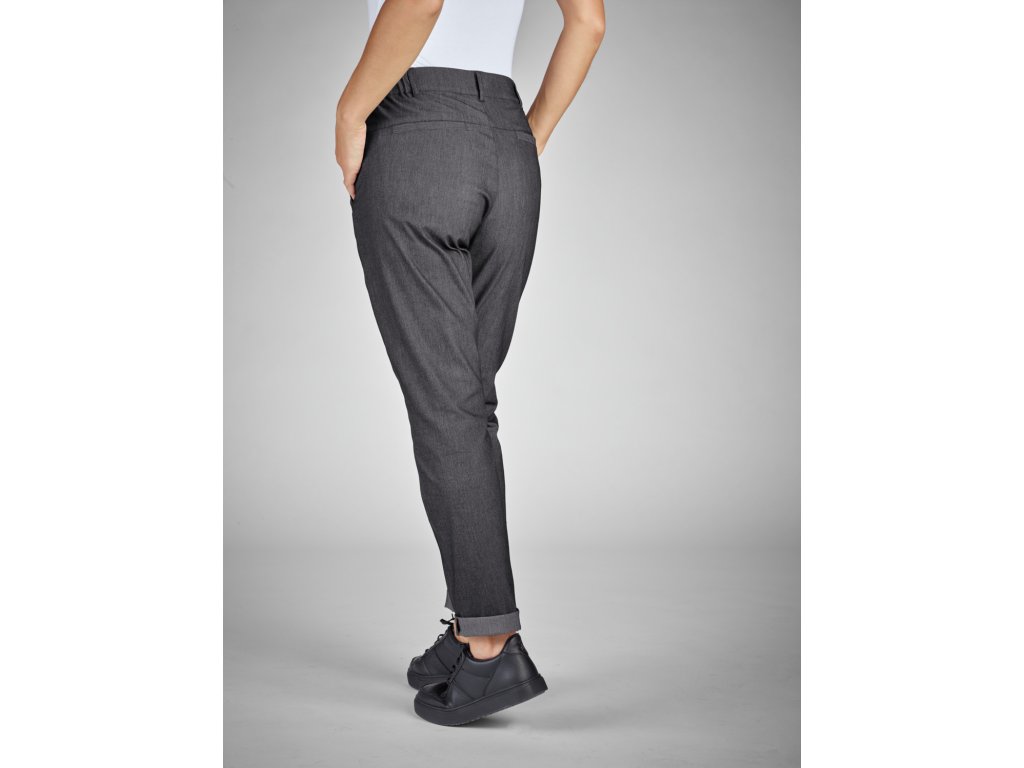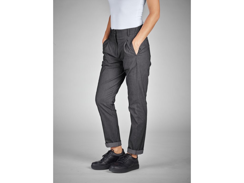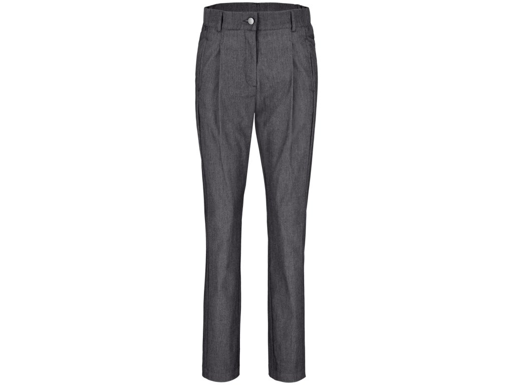 51 % bavlna, 46 % polyester, 3 % elastan. 200 g/m². Pranie na 60°. Moderné kuchárske nohavice so záhybom pre ženy z priedušnej a mierne elastickej funkčnej tkaniny. S pohodlným elastickým pásom na bokoch, dvoma lemovanými zadnými vreckami a bočnými rozparkovými vreckami. V páse sú pútka na opasok a klasické zapínanie na gombíky. Pohodlný strih so zúženou nohavicou. Vnútorná dĺžka dámy: 78 cm pri veľkosti 36.Dodatočné parametre