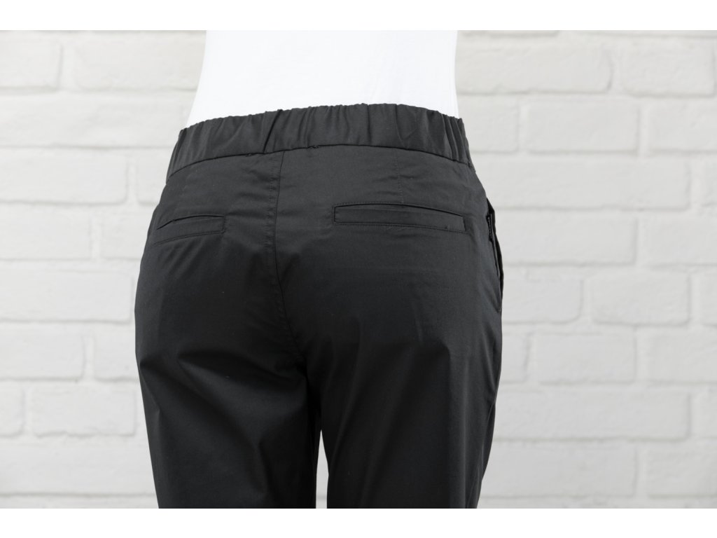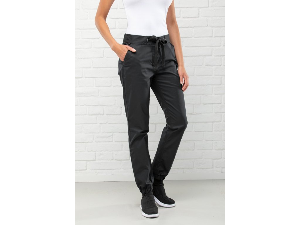 58 % bavlna, 42 % polyester. 180 g/m². Pranie na 60°. Módne dámske kuchárske nohavice s elastickým pásom. Vyrobené z priedušného funkčného materiálu WERIN®TEC Light. S pohodlným elastickým pásom a dvomi lemovanými vreckami na zadnej strane, s dvomi rozparkovanými vreckami na bokoch. Opasok má pútka na opasok a dá sa upraviť pomocou šnúrky. Pohodlný strih so zúženými nohavicami. Vnútorná dĺžka nohavíc: 75 cm vo veľkosti 36Dodatočné parametre