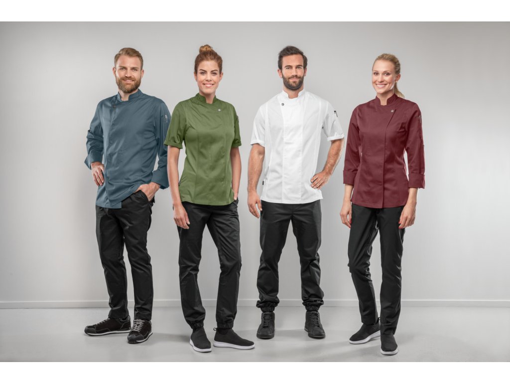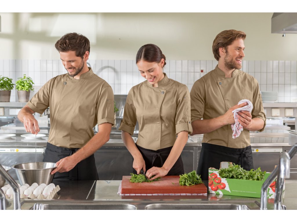 Kuchársky rondón pre dámy a pánov z extra ľahkého materiálu a robustného vlákna. So stojatým golierom, priedušnými dielmi zo sieťoviny po stranách, dvojdielnym vreckom na ramene vľavo a pútkom vzadu na golieri. Kryté cvokové zapínanie. Dostupný s krátkym alebo dlhým rukávom, dlhé rukávy sú rolovateľné nahor. Dámsky model je mierne zúžený. 65% polyester, 35% bavlna. 160 g/m². 60° pranie Dĺžka chrbta dámy: 68 cm pri veľkosti 36 Dĺžka chrbta páni: 76 cm pri veľkosti 50Dodatočné parametre