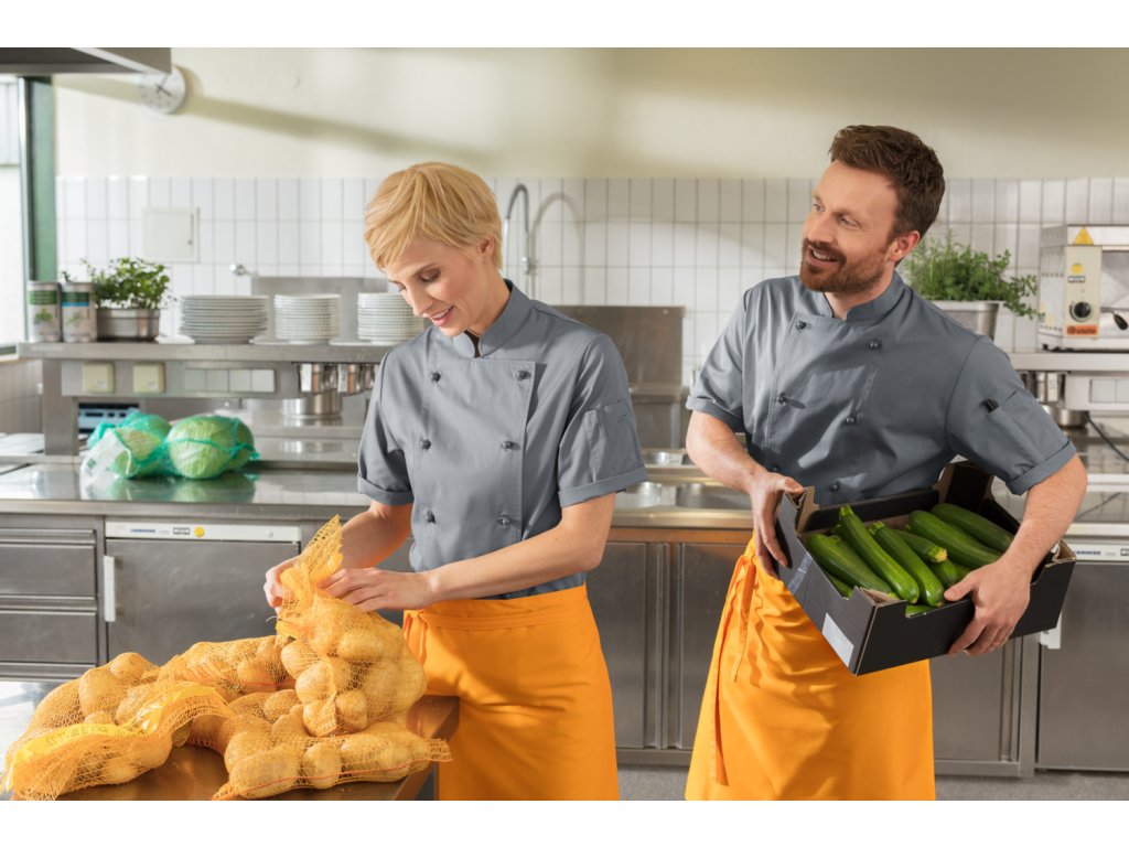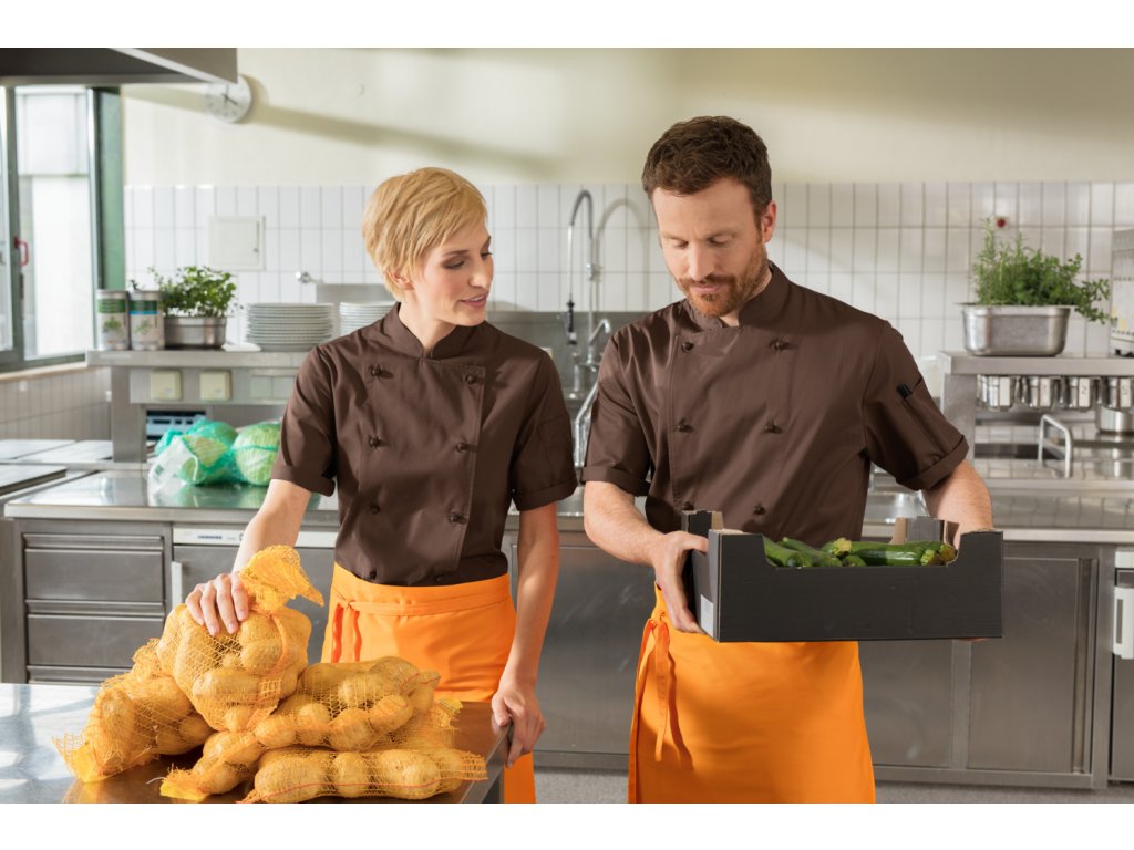 Dámsky a pánsky kuchársky rondón vo viacerých atraktívnych farbách. Vďaka ľahkému materiálu zo zmesi bavlna-polyester sa príjemne nosí aj pri vysokých teplotách. S 2-dielnym vreckom na ramene. 5-radové zapínanie, vrátane gombíkov vo farbe rondónu. Jednoduchý na údržbu a žehlenie. Vyberte si z viacerých dĺžok rukávov: dlhý alebo krátky rukáv pri pánskom rondóne, dlhý, 3/4 alebo krátky rukáv pri mierne zúženom dámskom rondóne. 65 % polyester, 35 % bavlna. 160 g/m². 60° pranie Dĺžka chrbta dámy: 73 cm pri veľkosti 36 Dĺžka chrbta páni: 78 cm pri veľkosti 50Dodatočné parametre