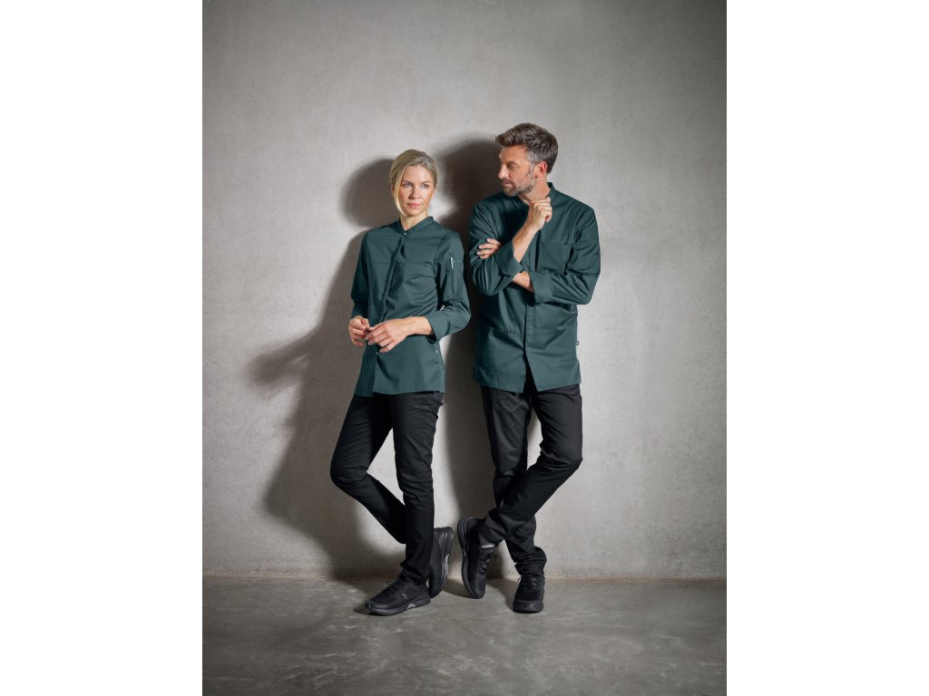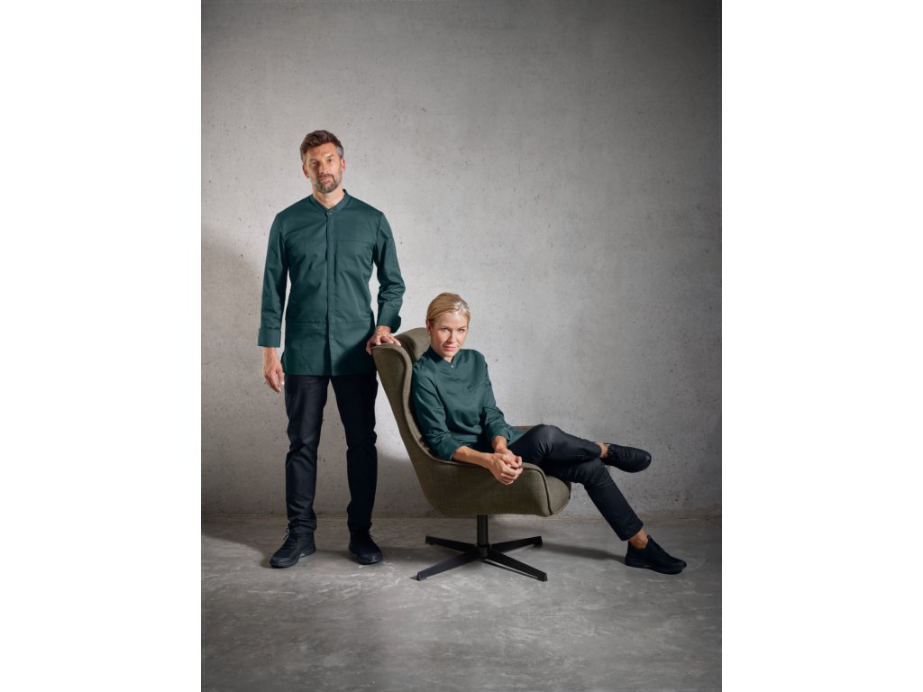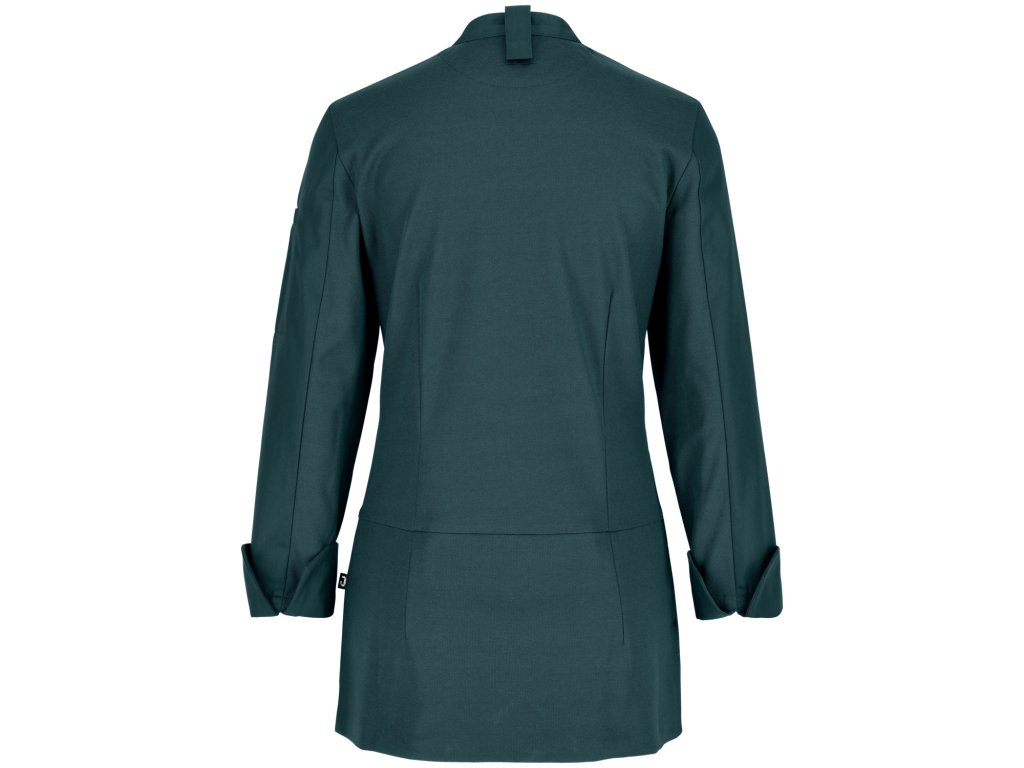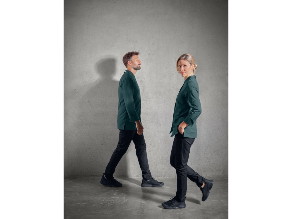 65 % polyester, 35 % bavlna. 150 g/m². Pranie na 60° Elegantná dámska bunda do kuchyne, servisu, baru a hotela, vyrobená z mimoriadne ľahkej a priedušnej tkaniny. S plochým úzkym stojatým golierom, skrytým zapínaním na cvočky v strede a dvojdielnym vreckom na ramene. S vloženým vreckom na šve na hrudi, ďalšími dvoma praktickými vreckami na šve v spodnej časti bundy a pútkom na zásteru s náprsenkou vzadu na krku. Rukávy sú zakončené klasickou ohrnutou manžetou. Celá zadná časť, ako aj podpazušie sú vyrobené z priedušného a elastického piké materiálu, ktorý zaručuje štíhly a mimoriadne pohodlný strih. Mierne prispôsobený strih. Dĺžka chrbta dámy: 72 cm pri veľkosti 36.Dodatočné parametre
