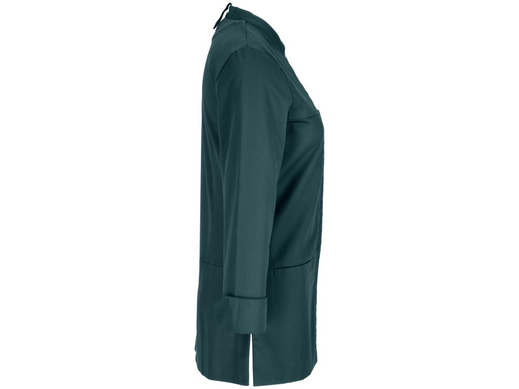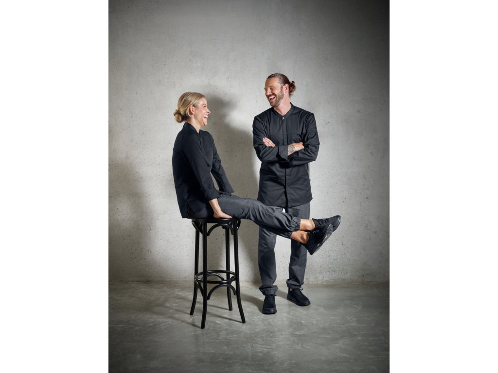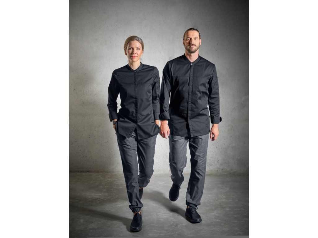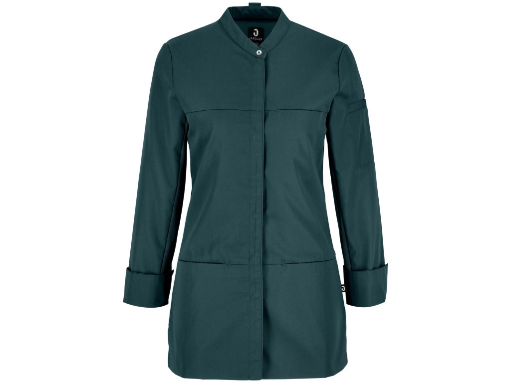 65 % polyester, 35 % bavlna. 150 g/m². Pranie na 60° Elegantná dámska bunda do kuchyne, servisu, baru a hotela, vyrobená z mimoriadne ľahkej a priedušnej tkaniny. S plochým úzkym stojatým golierom, skrytým zapínaním na cvočky v strede a dvojdielnym vreckom na ramene. S vloženým vreckom na šve na hrudi, ďalšími dvoma praktickými vreckami na šve v spodnej časti bundy a pútkom na zásteru s náprsenkou vzadu na krku. Rukávy sú zakončené klasickou ohrnutou manžetou. Celá zadná časť, ako aj podpazušie sú vyrobené z priedušného a elastického piké materiálu, ktorý zaručuje štíhly a mimoriadne pohodlný strih. Mierne prispôsobený strih. Dĺžka chrbta dámy: 72 cm pri veľkosti 36.Dodatočné parametre
