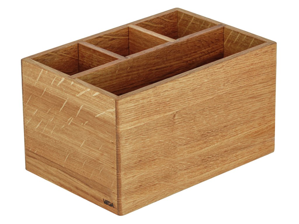 Drevená debnička na príbory a stolové doplnky. Vyberateľná umelohmotná podložka na spodku debničky. S 3 malými priehradkami (6x6 cm) a 1 veľkým priečinkom (19x6 cm). Nie je vhodná do umývačky riadu.Dodatočné parametre