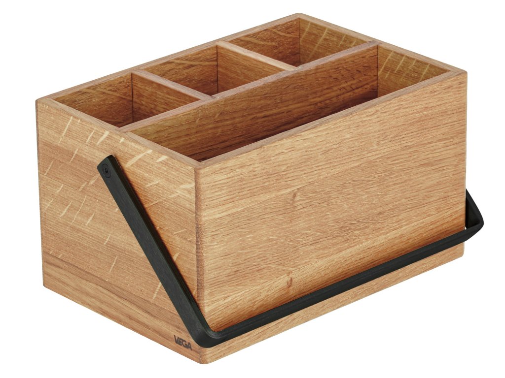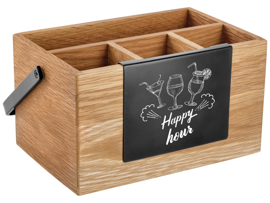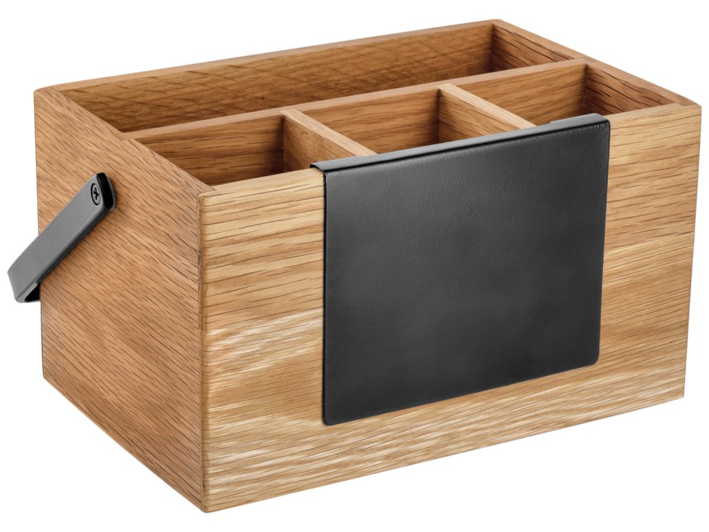 Drevená debnička s kovovou rúčkou na príbory a stolové doplnky. Vyberateľná umelohmotná podložka na spodku debničky. S 3 malými priehradkami (6x6 cm) a 1 veľkým priečinkom (19x6 cm). Nie je vhodná do umývačky riadu.Dodatočné parametre