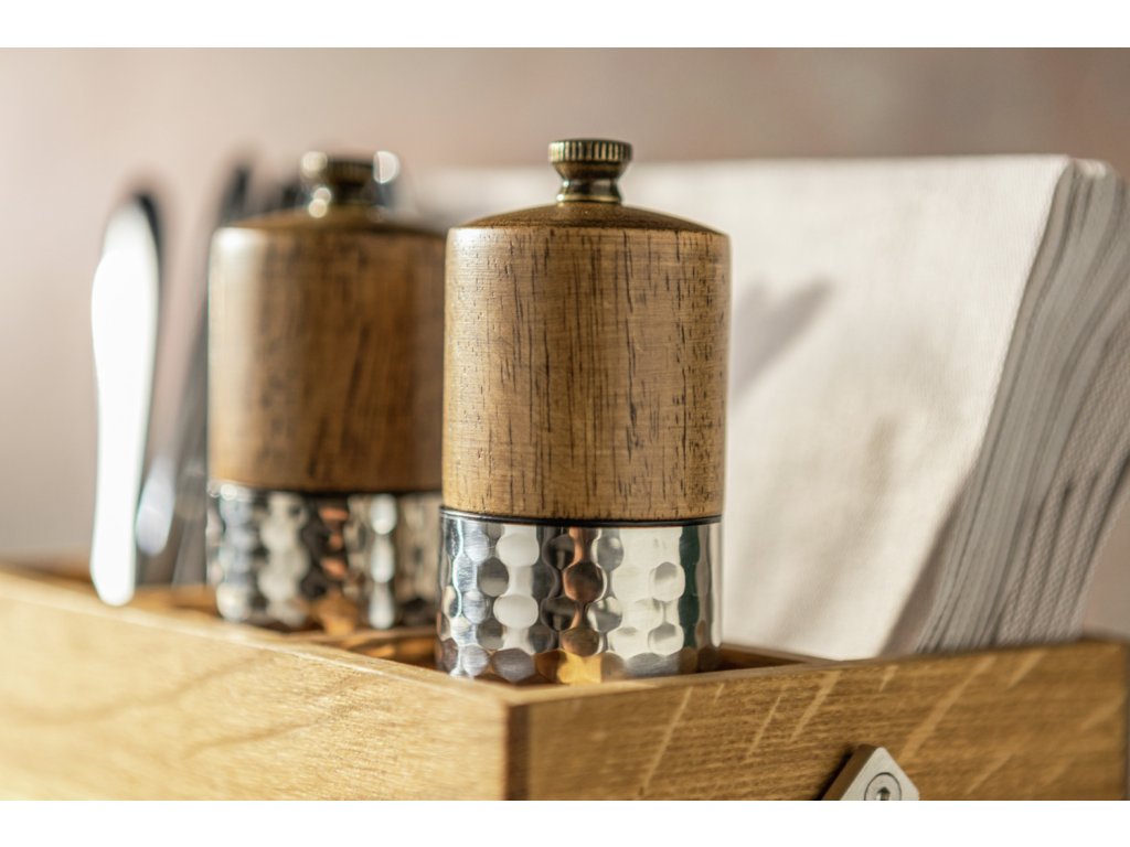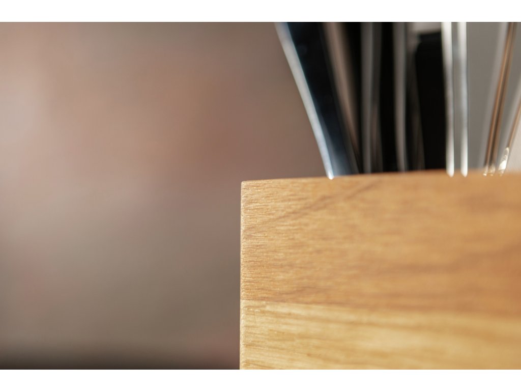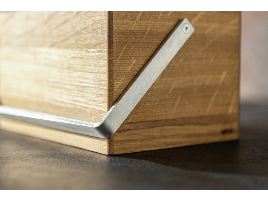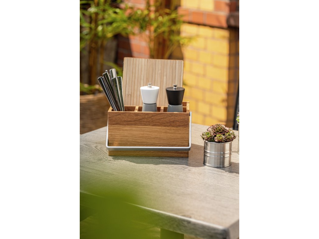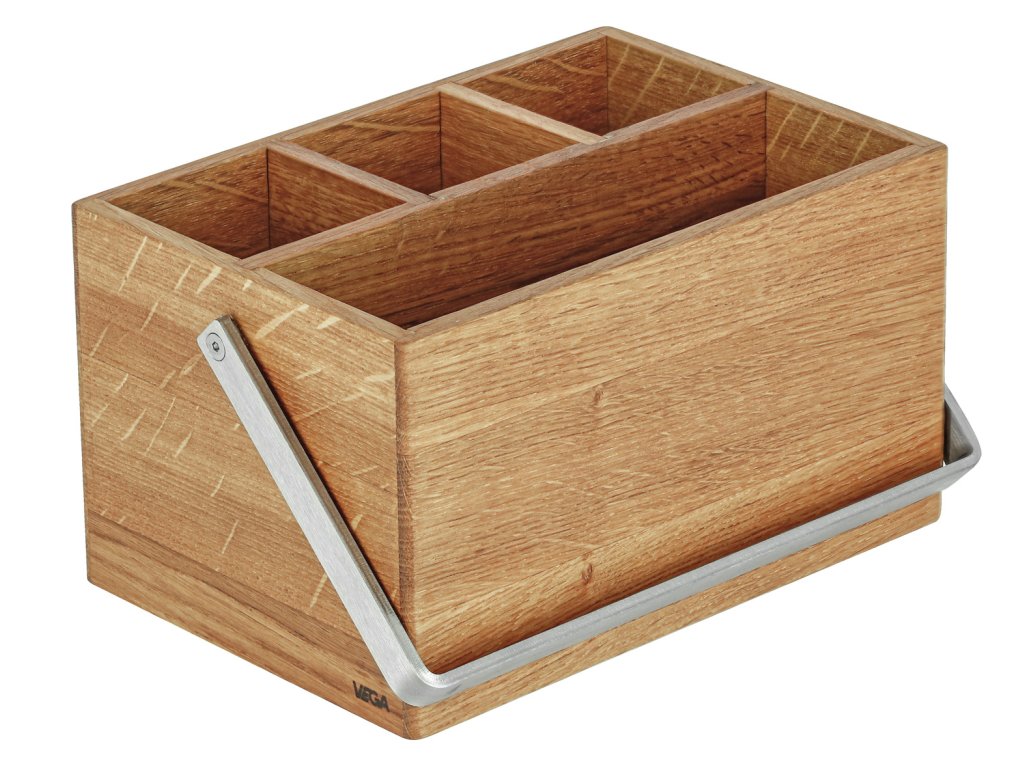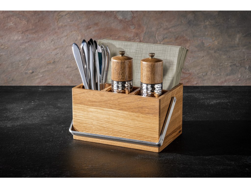 Drevený kontajner s kovovou rúčkou na príbory a stolové doplnky. Vyberateľná plastová podložka na spodku zabraňujúca znečisteniu. S 3 malými priehladkami (6x6 cm) a 1 veľkým priečinkom (19x6 cm). Nie je vhodný do umývačky riadu.Dodatočné parametre
