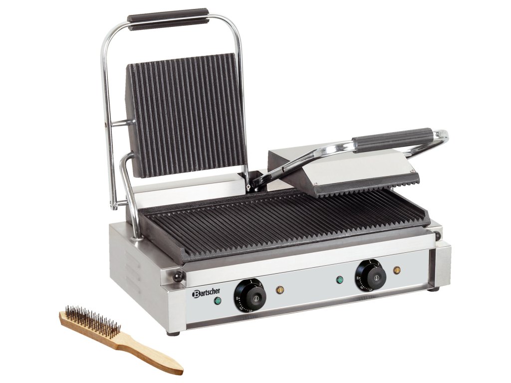 Dvojkontaktný gril s krytom z nehrdzavejúcej ocele a drážkovanými liatinovými grilovacími doskami pre optimálny prenos tepla. Dva samostatne nastaviteľné termostaty od 50 °C do 300 °C. Kontrolka nahriatia, kontrolka zapnutia/vypnutia a miska na odkvapkávanie tuku. Dodáva sa s čistiacou kefkou. Dvojročná záruka. Horné grilovacie dosky š 215 x d 215 mm; dolná grilovacia doska š 470 x d 230 mmDodatočné parametre