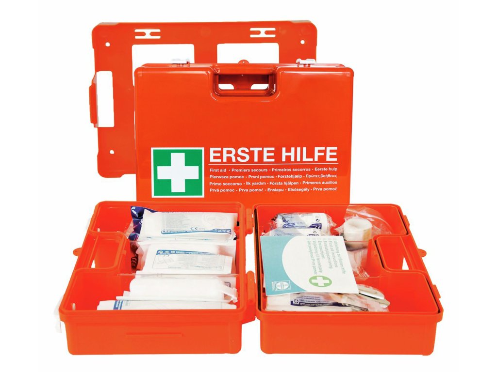 Standardmäßiger Erste-Hilfe-Koffer nach DIN 13157 7 (64-teilig). Koffer aus robustem ABS-Kunststoff, mit Wandhalterung und Gummidichtung. Inhalt streng kontrolliert nach dem Medizinproduktegesetz. Der Erste-Hilfe-Koffer ist mit blauen, detektierbaren Pflastern ausgestattet. Das macht ihn zum idealen Verbandskasten für die Lebensmittelindustrie. Detektierbare Pflaster können von einer Detektormaschine erkannt werden. Somit kontaminieren sie nicht die Lebensmittel, falls die Pflaster einmal in die Produktion geraten sollten. Die blaue Farbe der detektierbaren Pflaster sorgt für eine gute optische Erkennbarkeit, da sie sich von den Nahrungsmitteln optimal abhebt - für mehr Hygiene und Sicherheit in der Lebensmittelproduktion. Darüber hinaus verfügt der Verbandskoffer über sehr praktische Innenfächer. Die Innenfächer sorgen für Ordnung und Übersichtlichkeit, damit im Notfall die Erste-Hilfe-Ausrüstung schneller griffbereit ist. In Abhängigkeit von Art und Größe eines Betriebes sind nach den Unfallverhütungsvorschriften der Berufsgenossenschaften Erste-Hilfe-Einrichtungen bereitzuhalten. Als Grundausstattung müssen abhängig von der Mitarbeiterzahl folgende Verbandkästen zu Verfügung stehen: Herstellungs- und Verarbeitungsbetriebe: 1 - 20 Beschäftigte 1x DIN 13 157 21 - 100 Beschäftigte 1x DIN 13 169 je 100 weitere Beschäftigte 1x DIN 13 169 Verwaltungs- und Handelsbetriebe: 1 - 50 Beschäftigte 1x DIN 13 157 51 - 300 Beschäftigte 1x DIN 13 169 je 300 weitere Beschäftigte 1x DIN 13 169 Inhalt eines Verbandskasten nach DIN 13157: 1 Verbandtuch DIN 13 152-A, 60 x 80 cm 4 Einmalhandschuhe, Vinyl 2 Dreiecktücher DIN 13 168, weiß, 96 x 96 x 136 cm 3 Verbandpäckchen DIN 13 151-M 1 Verbandpäckchen DIN 13 151-G 1 Verbandpäckchen DIN 13 151-K 2 Fixierbinden DIN 61 634, 6 cm x 4 m 2 Fixierbinden DIN 61 634, 8 cm x 4 m 2 Augenkompressen, oval, 5 x 7 mm 1 Schere DIN 58 279-B19, kniegebogen 1 Rettungsdecke, 210 x 160 cm, gold/silber 1 Rolle Heftpflaster DIN 13 19, 2,5 cm x 5 m 8 Wundschnellverbände DIN 13 19, 1 cm x 6 cm 1 Kälte-Sofortkompresse, selbstaktivierbar 6 Kompressen, 10 x 10 cm 2 Folienbeutel, wiederverschließbar 4 Fingerverbände, 12 x 2 cm 4 Fingerkuppen Verbände, ca. 4 x 7 cm 4 Pflasterstrips, 19 x 72 mm 8 Pflasterstrips, 25 x 72 mm 5 Vliestücher 1 Anleitung zur Ersten HilfeDodatočné parametre