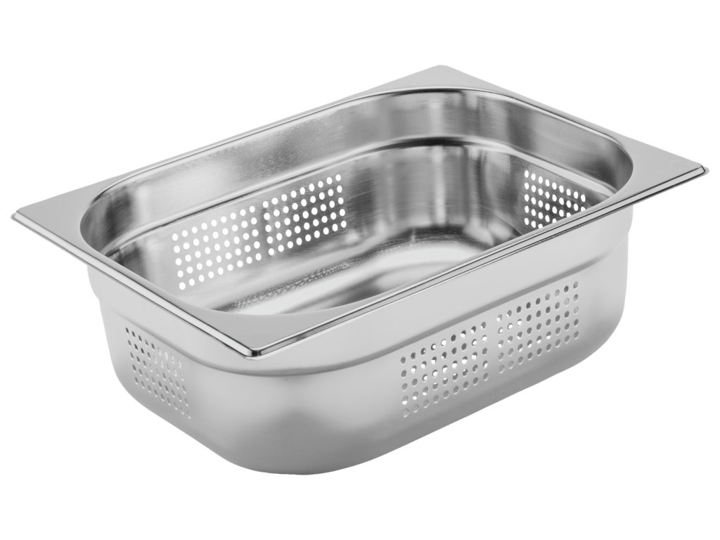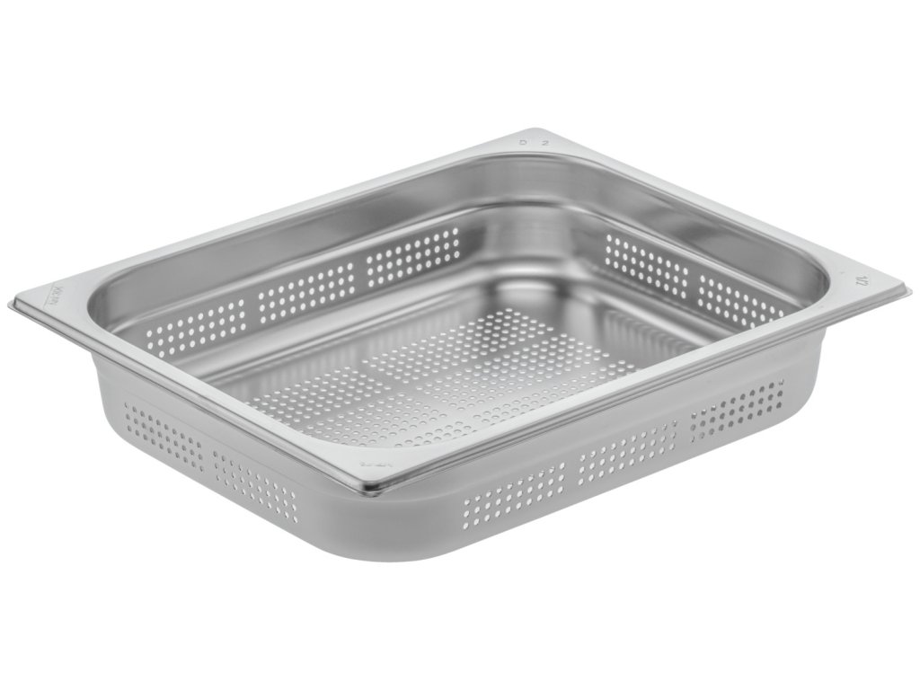 Perforovaná GN nádoba 1/2 z chrómniklovej nehrdzavejúcej ocele 18/10, odolná proti korózii. Hrúbka materiálu: 0,8 mm. S praktickými uškami na stohovanie na jednoduché vyberanie naskladaných nádob. Vhodné do umývačky riadu. Odporúčame z času na čas vyčistiť octom alebo citrónovým čistiacim prostriedkom, aby sa zachoval lesk nádob.Dodatočné parametre