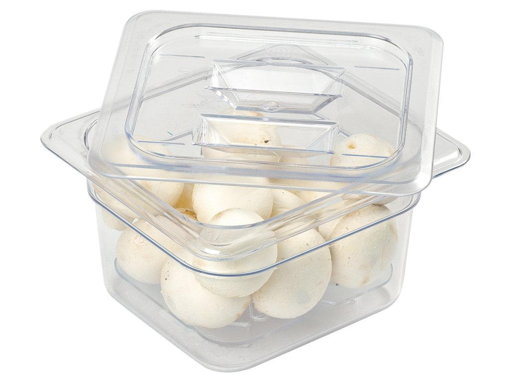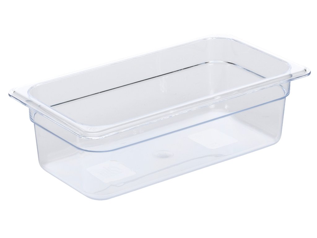 GN nádoba z priehľadného polykarbonátu. S praktickým stohovacím vačkom. Odolné voči teplotám od -40 °C do +99 °C. Obsah možno optimálne kontrolovať vďaka označeniam plnenia na vonkajšej strane. Objednajte si zároveň zodpovedajúce veka (vrátane výklenku na rukoväť) a odtokové mriežky zo skupiny Bena. Vhodné pre potraviny, umývačku riadu a mikrovlnnú rúru.Dodatočné parametre