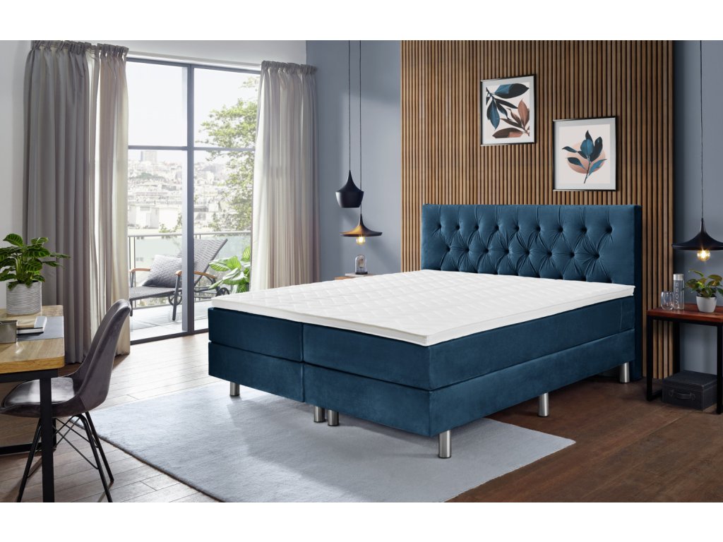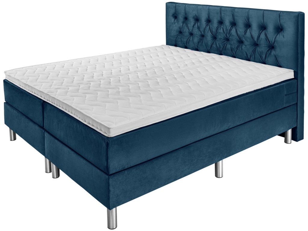 Hotelová posteľ v praktickej kompletnej súprave. Prázdny box. Čalúnený rám. Päťzónové taštičkové pružinové jadro s 540 pružinami na 2 m². Vrchný matrac zo studenej peny pre dobrý komfort spánku. Čelo postele s typickým prešívaním Chesterfield - výška 115 cm. Nehrdzavejúce kovové nožičky v striebornej farbe. Vstupná výška: 58 cm. Výška nožičiek 16 cm + box 20 cm + matrac 17 cm + topper 5 cm spolu: 58 cm. S velúrovým poťahom. K dispozícii ako jednolôžko alebo manželská posteľ. Dodávka vrátane spojovacích prvkov. Nožičky postele sa pri dodaní nachádzajú v krabici.Dodatočné parametre