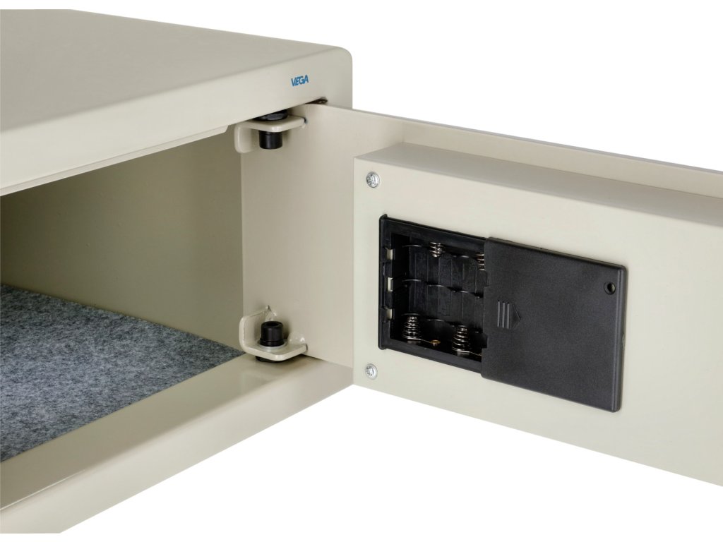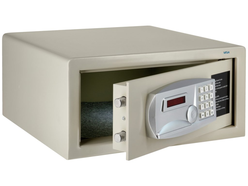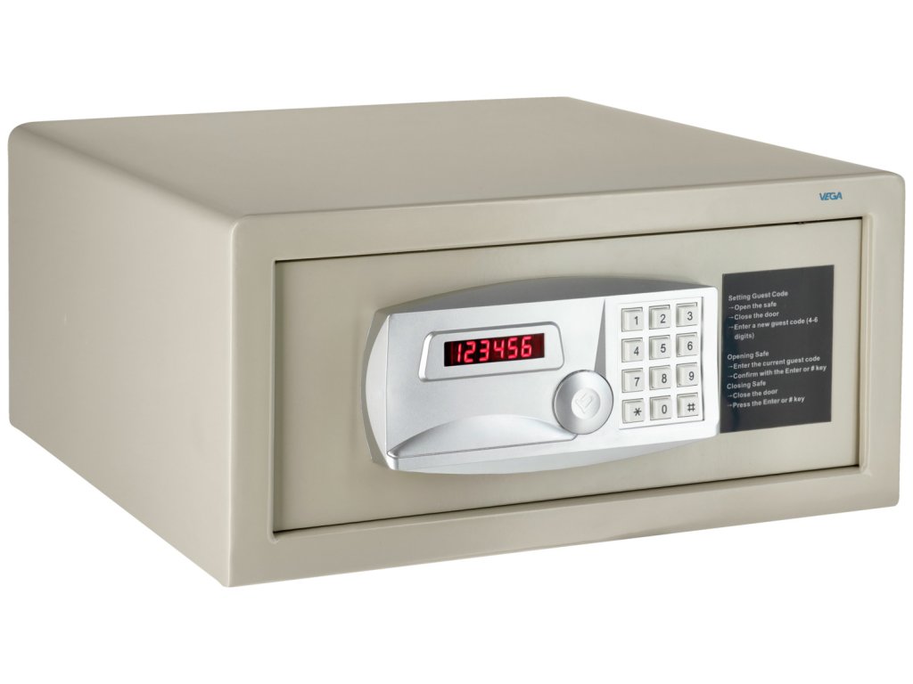 Robustný izbový trezor z tvrdenej ocele. Bezproblémová prevádzka a jednoduché používanie. Veľký, batériami napájaný displej zreteľne zobrazuje kód, aby sa zabránilo nesprávnemu zadaniu. Súčasťou je núdzový kľúč a hlavný kód. Hotelový izbový trezor má otvory na základni a zadnom paneli a možno ho nainštalovať pomocou priloženého montážneho príslušenstva na zabezpečenie trezora proti krádeži. Napájaný batériami (4x AA 1,5 V), batérie nie sú súčasťou dodávky.Dodatočné parametre