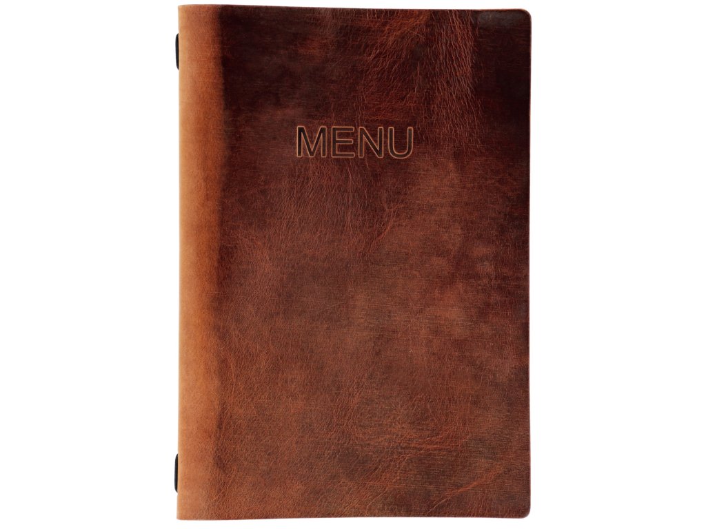 Jedálny lístok z pravej kože s ražbou "MENU". Zakladanie listov pod gumičku. Dvojité vnútorné listy A4 k dispozícii samostatne. Možnosť utierania.Dodatočné parametre