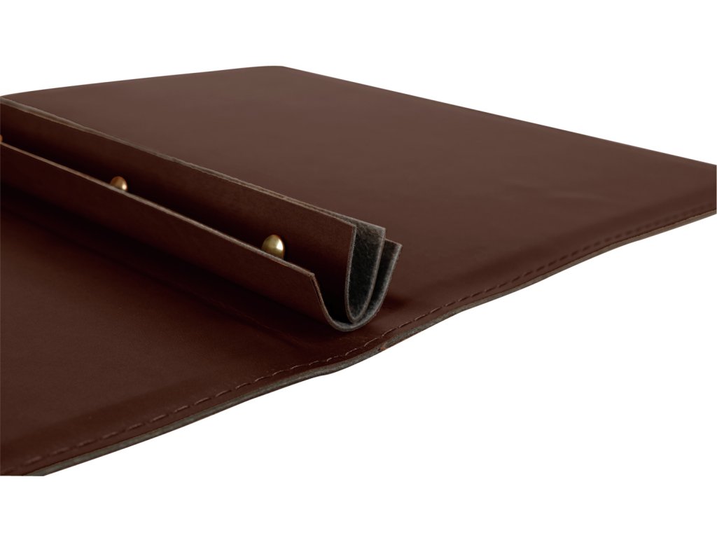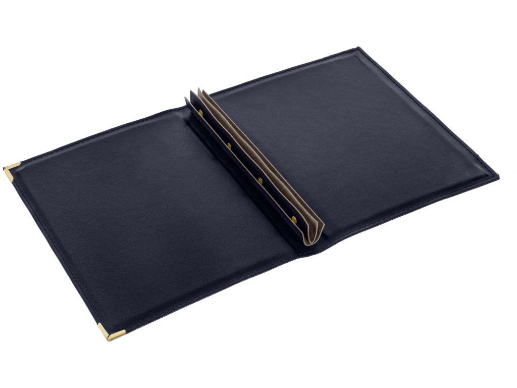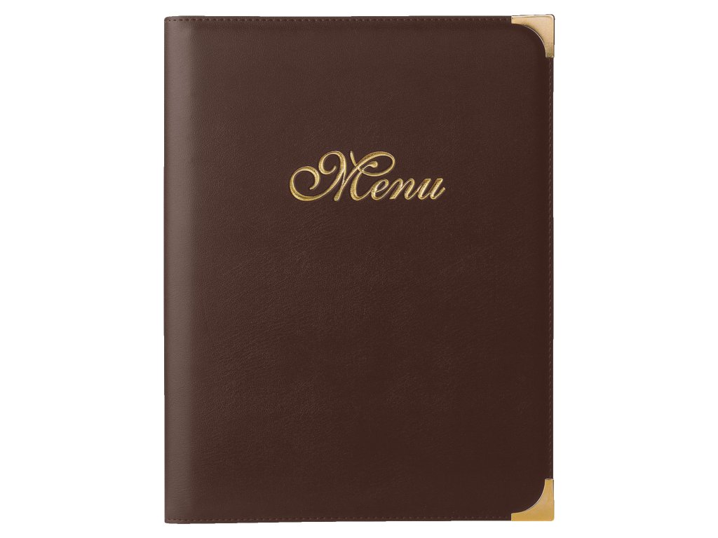 Jedálny lístok v podobe rozkladacieho knižného bloku z hladkej imitácie kože s reliéfnym nápisom "Menu" v ozdobnom písme. S kovovou ochranou okrajov a vnútornými skrutkami knihy. Zasúvací systém s priehľadnou fóliou a zodpovedajúcimi vložkami k dispozícii samostatne. Odpudzuje vlhkosť a nečistoty.Dodatočné parametre