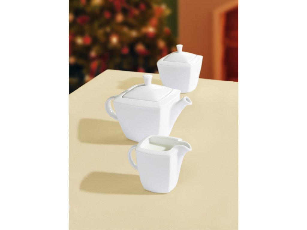Biela porcelánová kanvica s vrchnákom. Štvorcový tvar. Jednoduchý dizajn. Vhodná do umývačky riadu a mikrovlnnej rúry.Dodatočné parametre