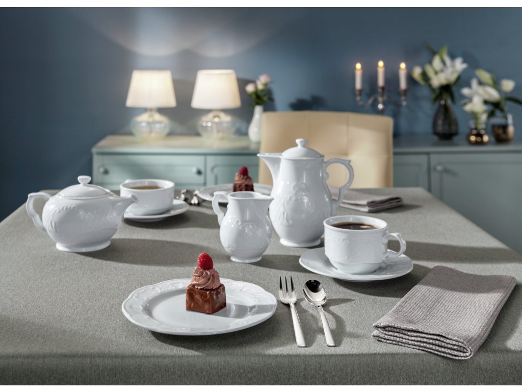 Biela porcelánová kanvica na kávu s vrchnákom. S filigránovým reliéfom. Vhodná do umývačky riadu a mikrovlnnej rúry.Dodatočné parametre