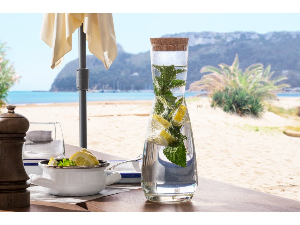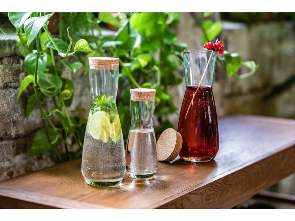 Sklenená karafa s korkovým vrchnákom s ryskou. Vhodná do umývačky riadu.Dodatočné parametre