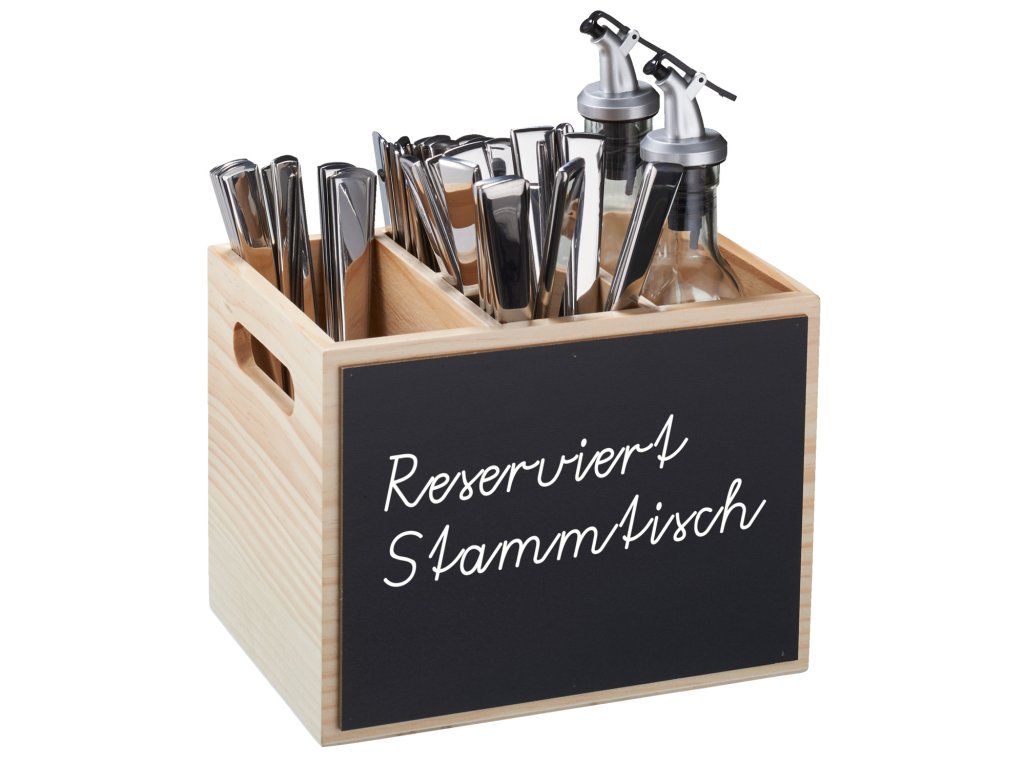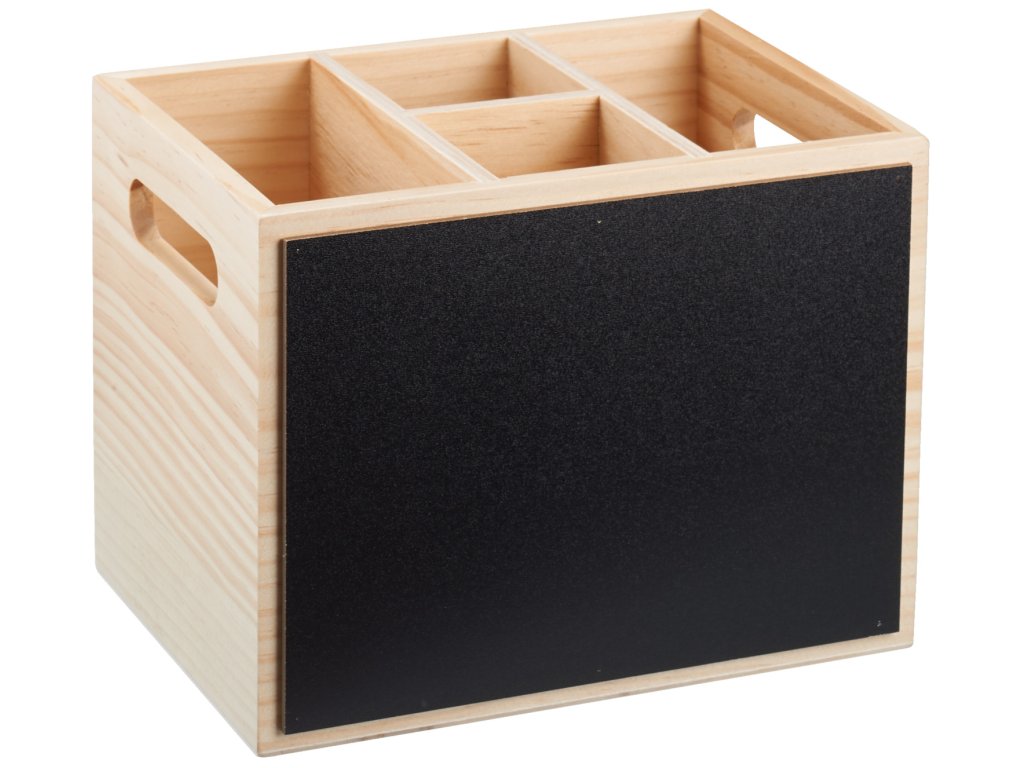 Kontajner na príbory z borovicového dreva s dvoma popisovateľnými panelmi na bokoch s rozmermi 19,5 x 14,5 cm. Štyri vnútorné priehradky na príbory, obrúsky a iné stolové doplnky, Dva otvory na rukoväte. Laková povrchová úprava. Drevené predmety nie sú vhodné do umývačky riadu.Dodatočné parametre