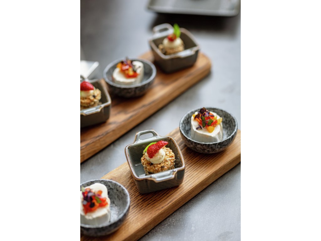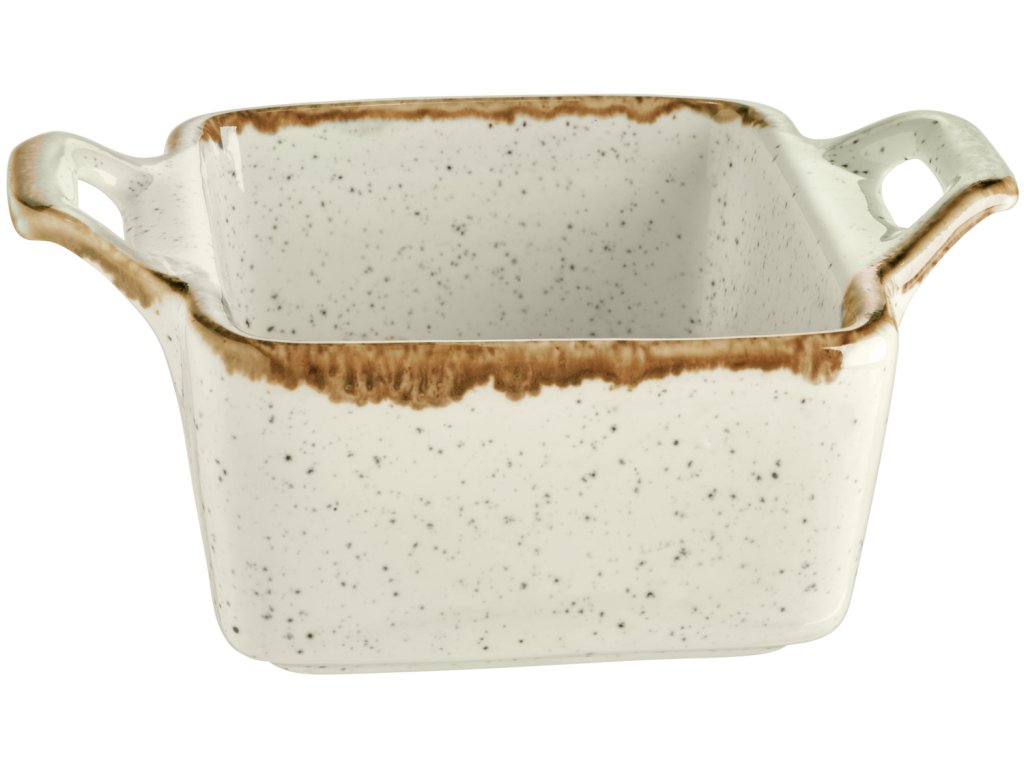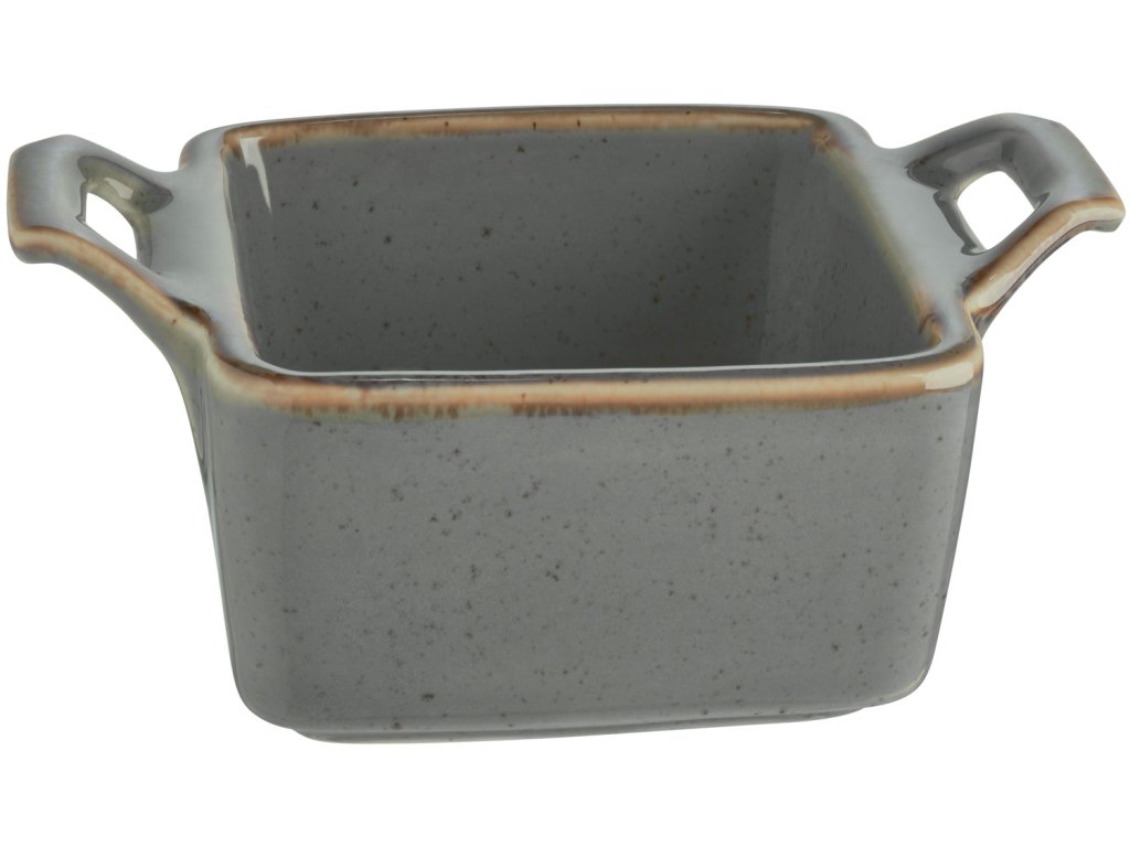 Farebná miska s uškami z porcelánu s keramickým vzhľadom. Štvorcový tvar. S mierne nepravidelnými okrajmi v glazúre. Vhodná do umývačky riadu a mikrovlnnej rúry.Dodatočné parametre