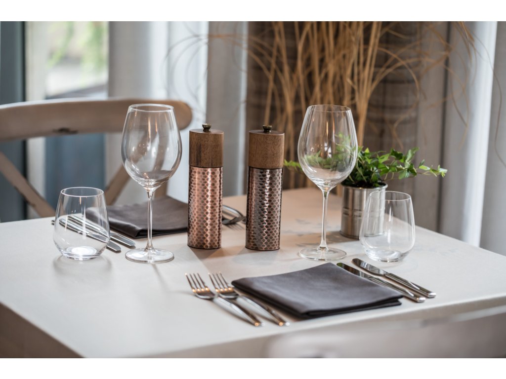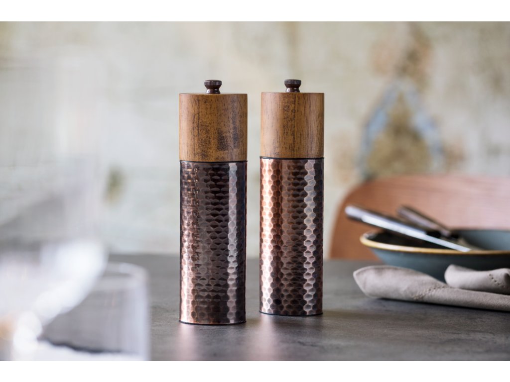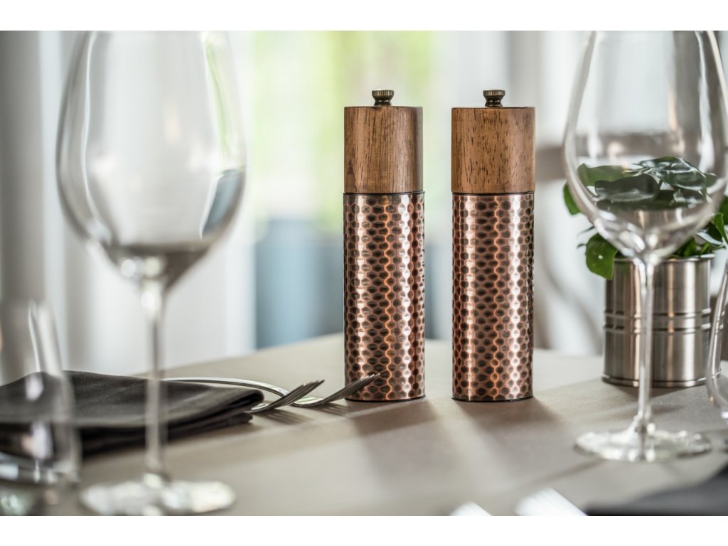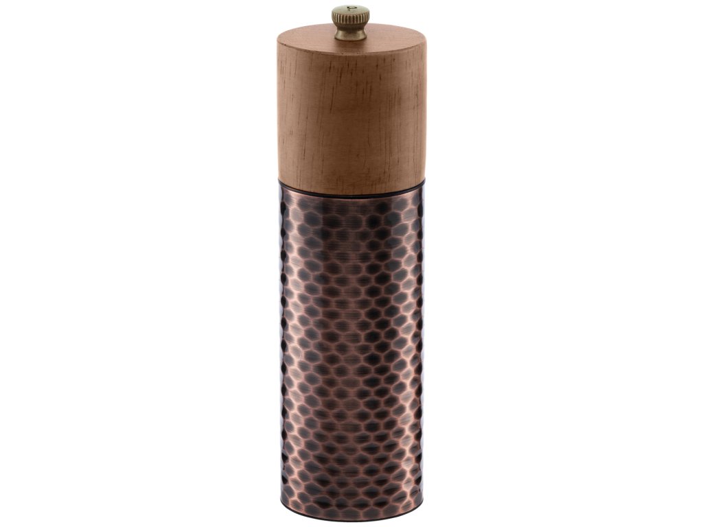 Mlynček na korenie vyrobený z medi s rotačným prvkom z pravého dreva. Má mimoriadne ľahký a odolný mlecí mechanizmus z uhlíkovej ocele. Obsah je označený písmenom "S" alebo "P" na nastavovacej skrutke v hornej časti.Dodatočné parametre