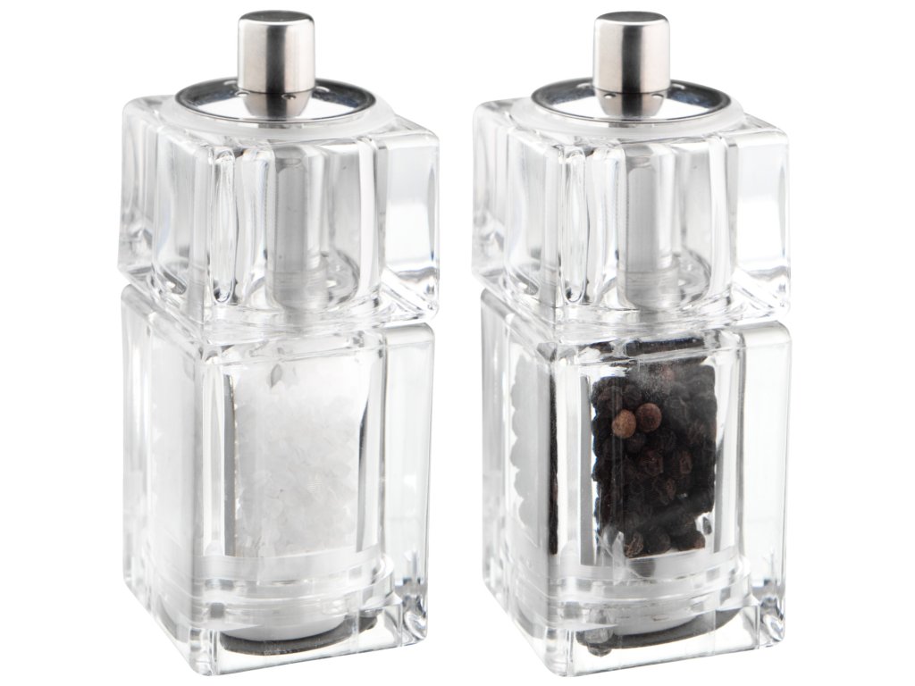 Malý mlynček na soľ a korenie z akrylu a chrómniklovej nehrdzavejúcej ocele 18/10. S integrovanou soľničkou a koreničkou v otočnom gombíku a keramickým mlynčekom. Možno umývať v umývačke riadu.Dodatočné parametre