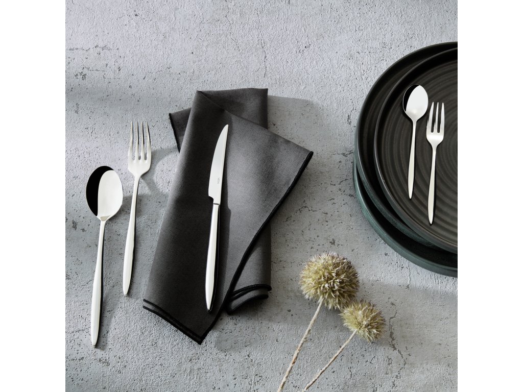 Chróm-niklová nehrdzavejúca oceľ 18/10, odolná proti korózii. Moderná vidlička na múčnik so štíhlou okrúhlou rukoväťou. Vysoko leštená. Hrúbka materiálu gastronomickej kvality 3,2 mm (merané v najhrubšom bode vidličky). Vhodná do umývačky riadu.Dodatočné parametre