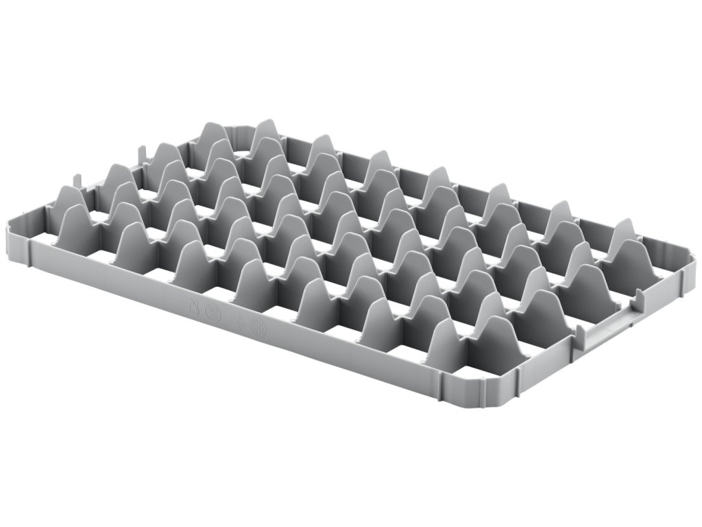 Fachwerkeinsatz für Transport- und Spülkastensysteme aus Polyethylen. Mit 40 Fächern. Ideal zum Transportieren von Gläsern mit maximal 6,7 cm, je nach Größe auch mit Henkel. Dieses Oberteil fixiert Gläser zusätzlich zum Boden durch seitliches Einrasten in die Griffaussparung des Kastens. Spülmaschinenfest.Dodatočné parametre