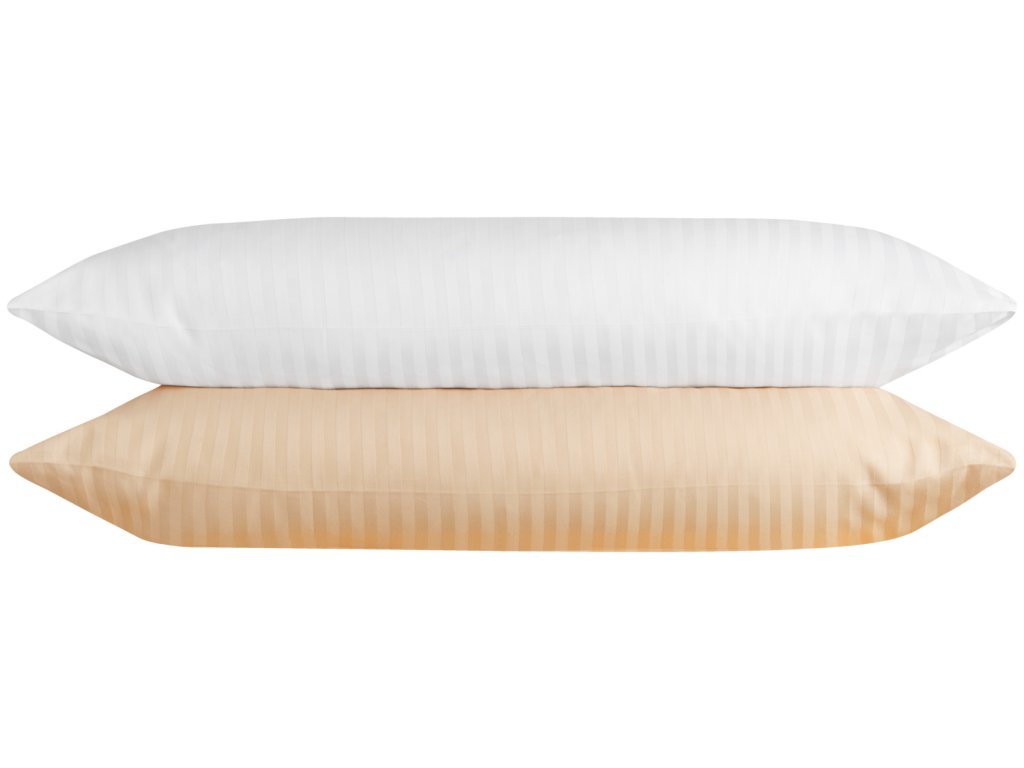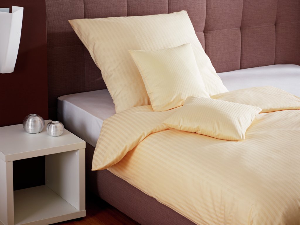 100 % bavlna. Hmotnosť približne 140 g/m². Elegantná posteľná súprava so vzorom damaškových pruhov (šírka 10 mm). Zachováva si uvedený rozmer po troch vypraniach. S hotelovým uzáverom a vrúbkovanými záševkami (od rozmeru 60x80 cm s vrúbkovanými záševkami). mercerované. Hustota vlákien (TC): 180 nití na palec Tkanie: damašekDodatočné parametre
