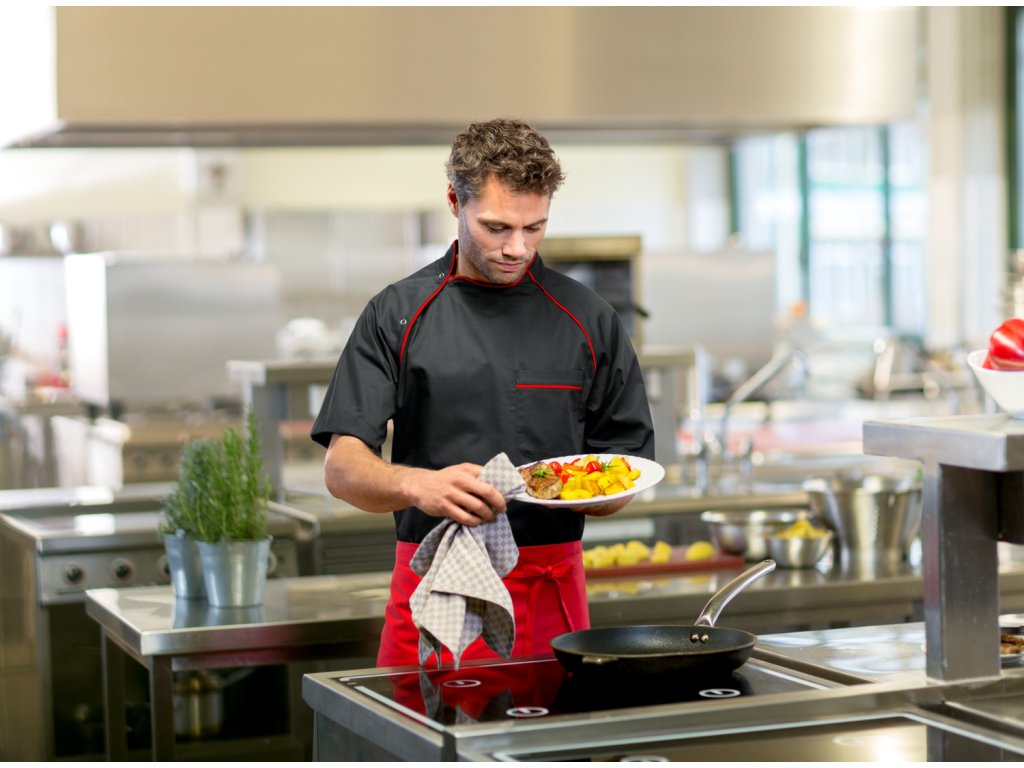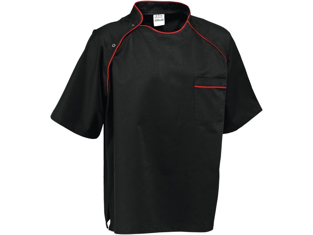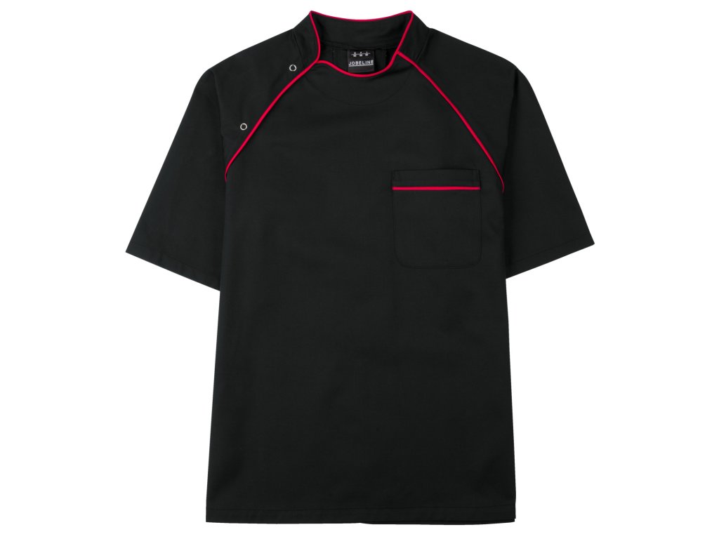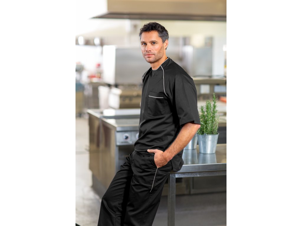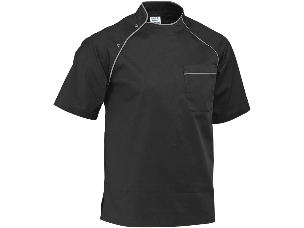 65 % polyester, 35 % bavlna. 200 g/m². Pranie na 60°. Módna, odolná pánska kuchárska košeľa s polovičnými rukávmi, bočnými rozparkami a boxovým záhybom na chrbte. Golier, raglánové rukávy a náprsné vrecko sú zakončené kontrastným lemovaním. Zapínanie na cvočky sa nachádza v pravom raglánovom šve s golierom. Rovný strih. Dĺžka chrbta: 75 cm vo veľkosti 50Dodatočné parametre